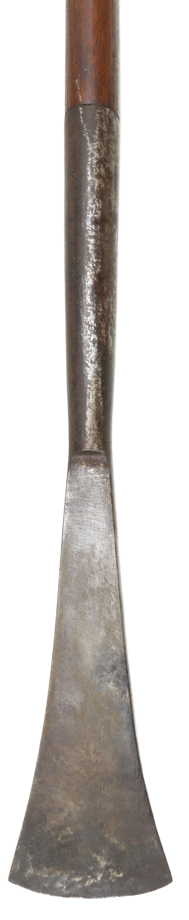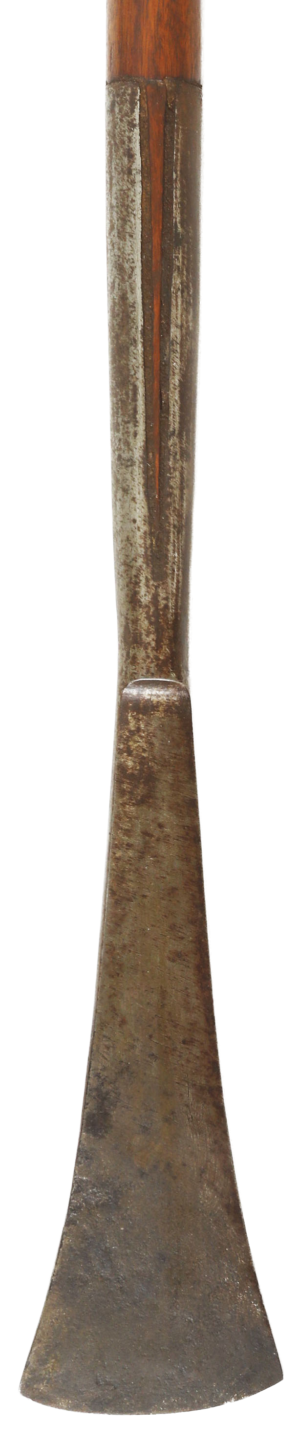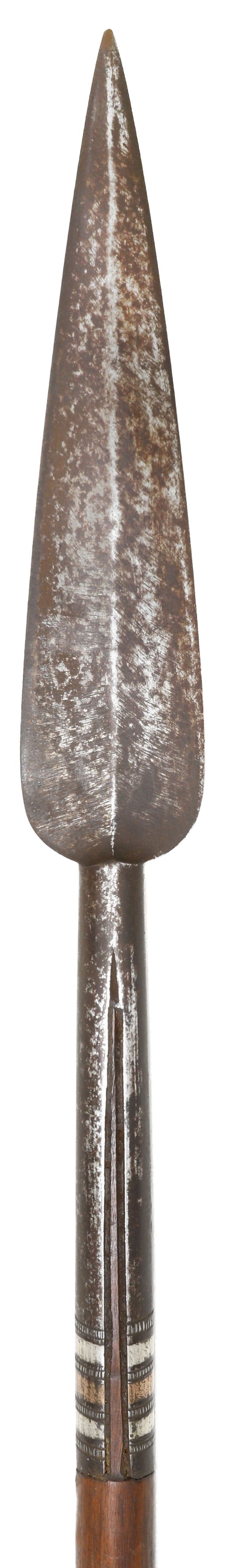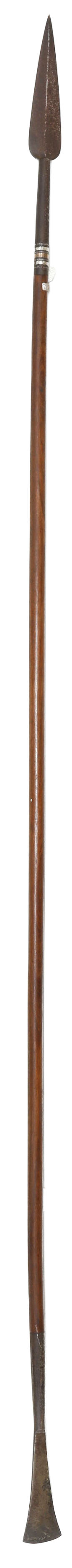 Late 19th-early 20th century.  65 3/4” length. Finely forged medially ridged leaf shaped point on open seam socket skillfully inlet to the hard wood haft. The socket base inlaid in copper and silver bands indicative of ownership by a high ranking warrior. Forge iron base piece with flared terminal for “digging in” on the impaling move, such as to stop a horse or camel. The workmanship matching the head.  Colorful, fine display and historical dating to the precolonial period of tribal raiding where the Tuareg would clandestinely attack other nomad groups, stealing all their possessions and sometimes, capturing them for the slave market. The raids were known as rezzous, and were a fundamental element of Tuareg culture, planned and executed on a frequent basis. Old collection tag attached.