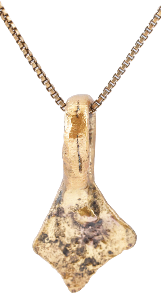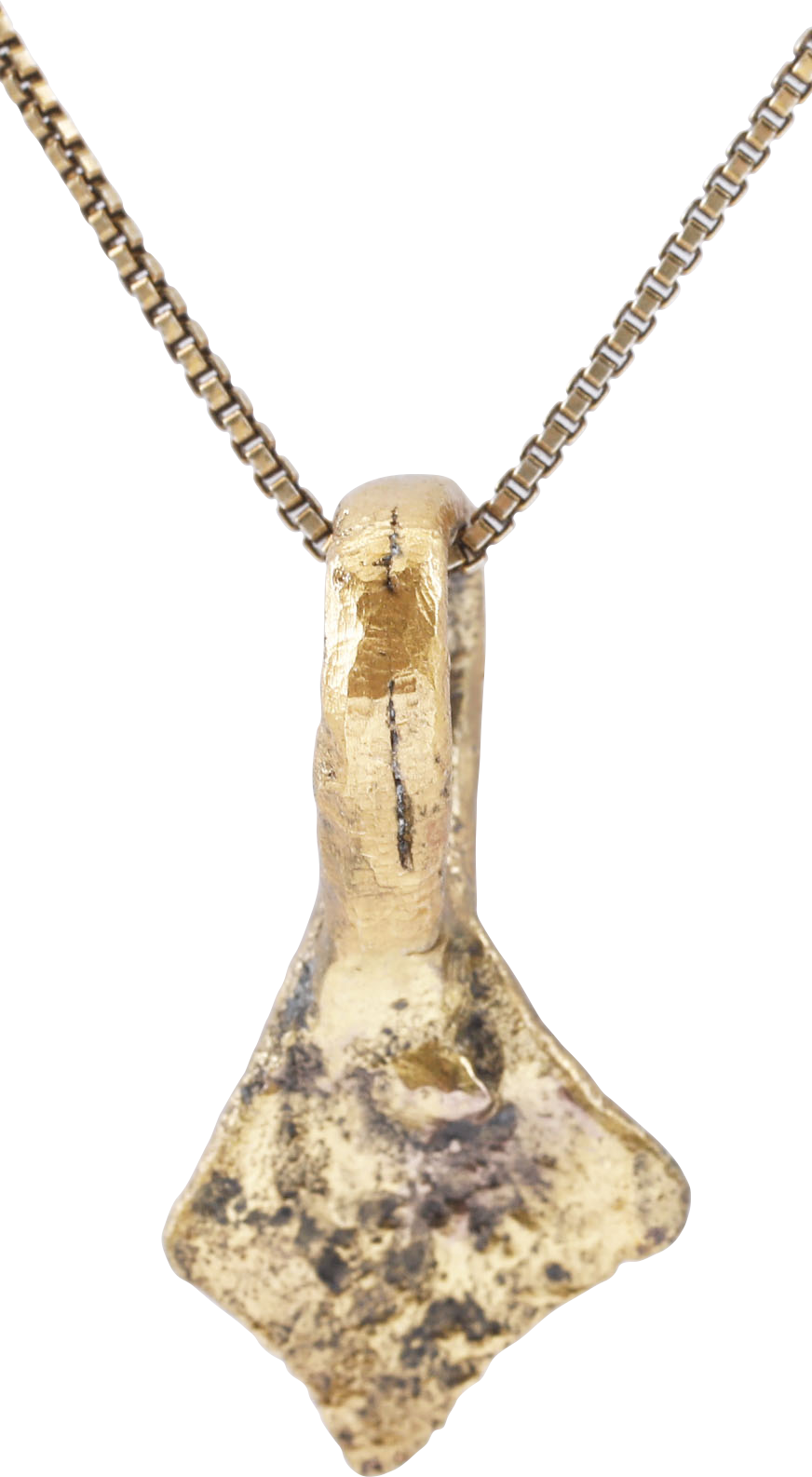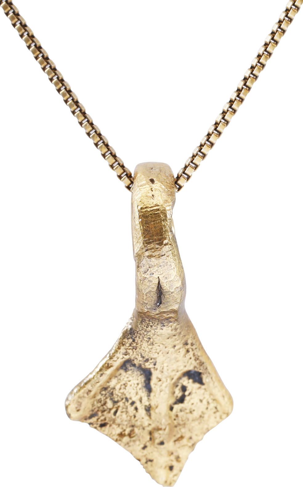 10th-11th century AD. Just under 1” (0.94”) height.  Bronze, shaped as a duck’s foot and intricately detailed with raised claws and connecting web. A burial at Fyrkat, Denmark contained the body of a woman of wealth and status buried with henbane seeds, which have hallucinogenic properties, and a wand as well as other objects. From these, archeologists concluded that she was a seeress or sorceress. (Among Vikings, only women were sorcerers). The grave contained a necklace hung with three duck feet pendants very similar to this. Professionally refurbished with the 24karat gold surface restored, on an 18” gilt Sterling silver neck chain for modern wear. Jewelry gift boxed with certificate of authenticity. As fine for quality, detail, and condition as they come.