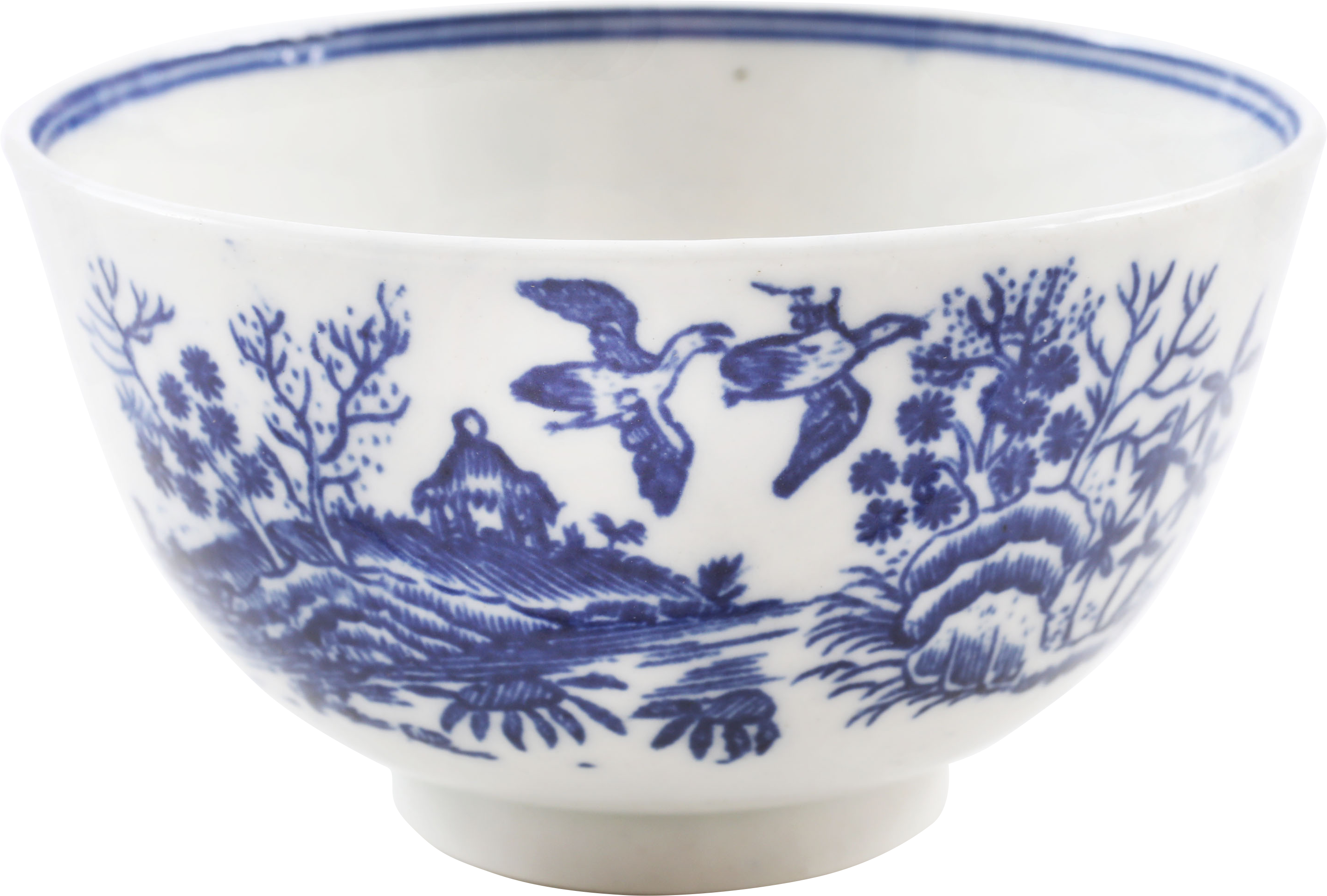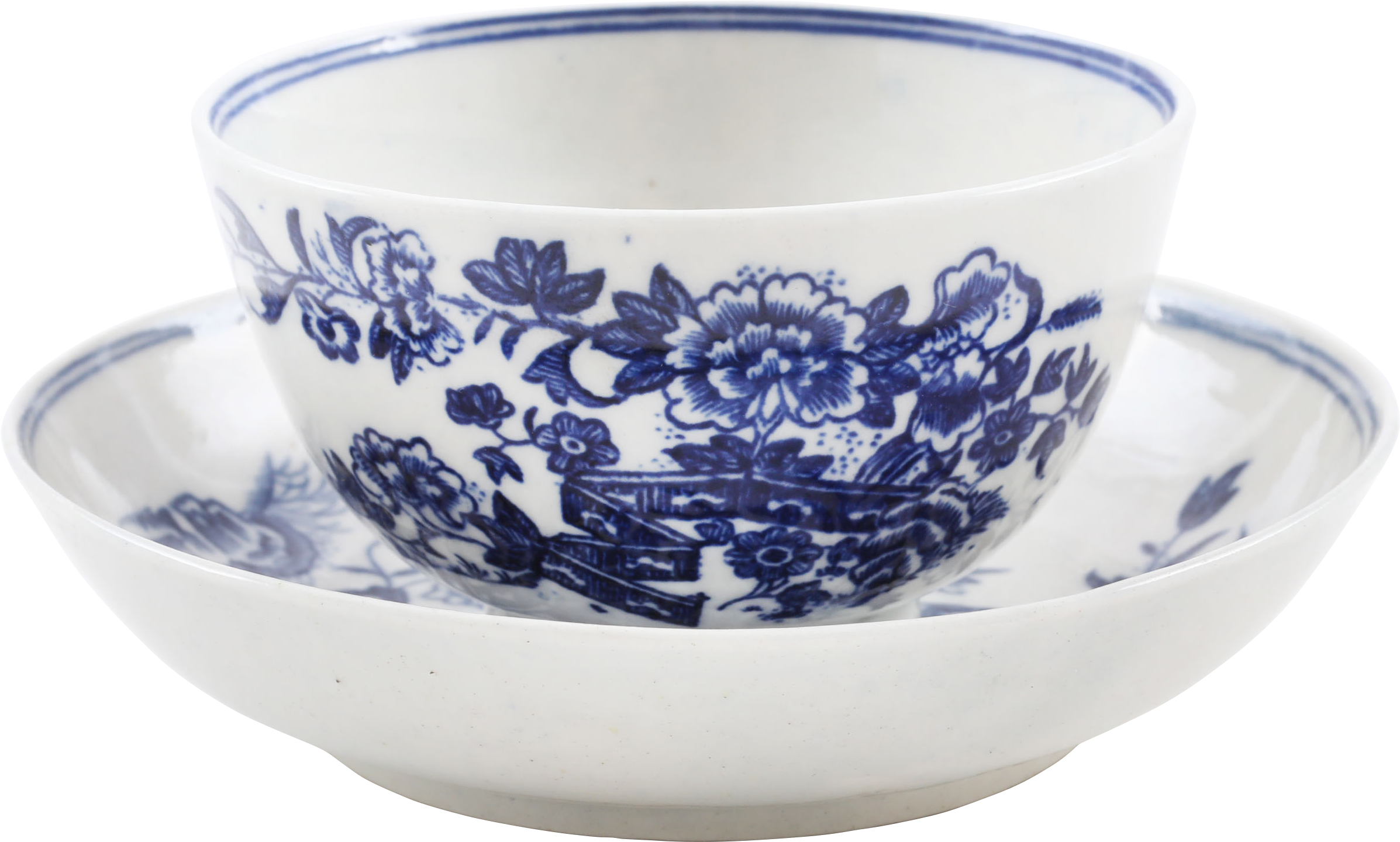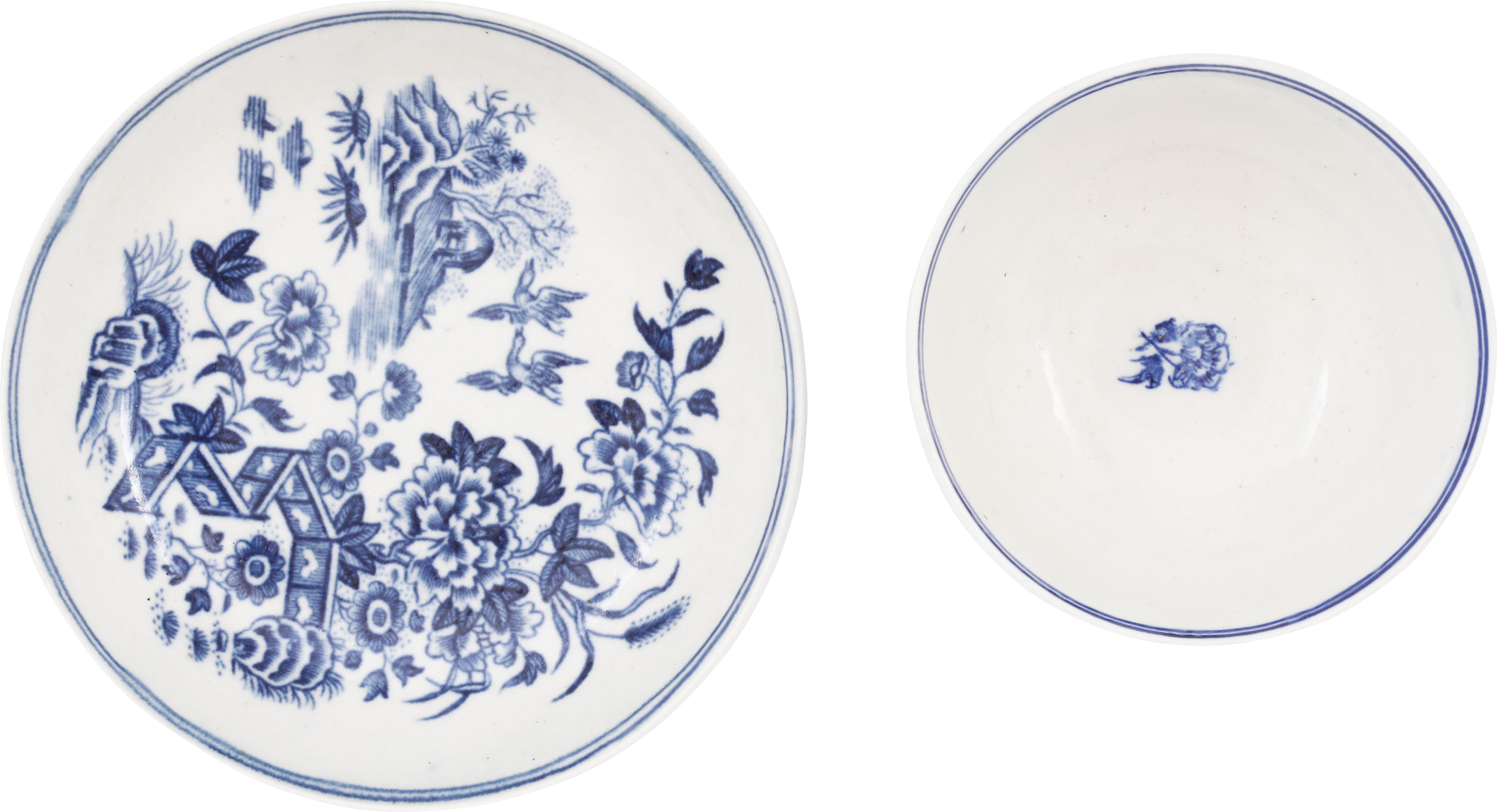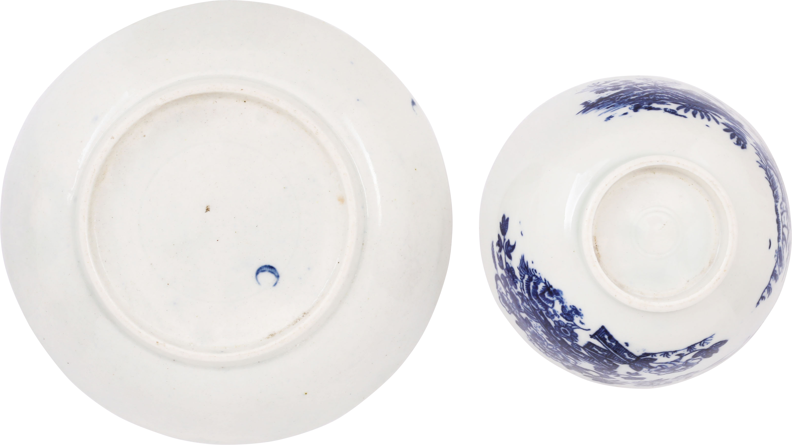 Early English Dr. Wall first period Worcester chinoiserie cup and saucer both decorated in blue on an off-white ground. Both pieces are decorated with the chinoiserie motif known as Fences with an Asian landscape with a house, a fenced in garden and flowers with two large geese flying overhead. The under bowl (Saucer) marked on the underside with the crescent moon mark used before 1783 during Dr. Wall's period at Worcester. The tea bowl unmarked as often encountered. In very good used condition as shown. 2 ⅞” and 4 ¼” diameter.