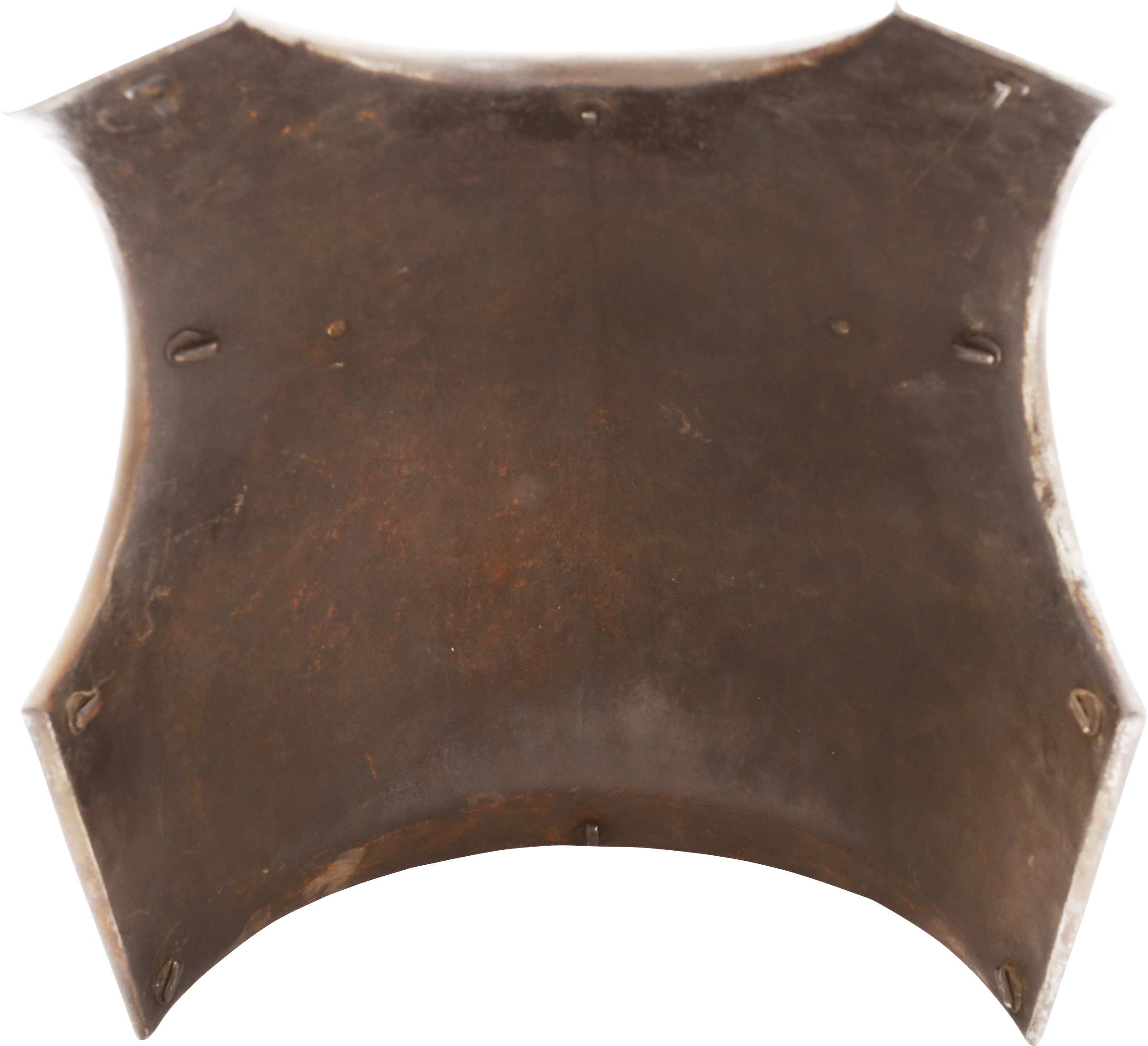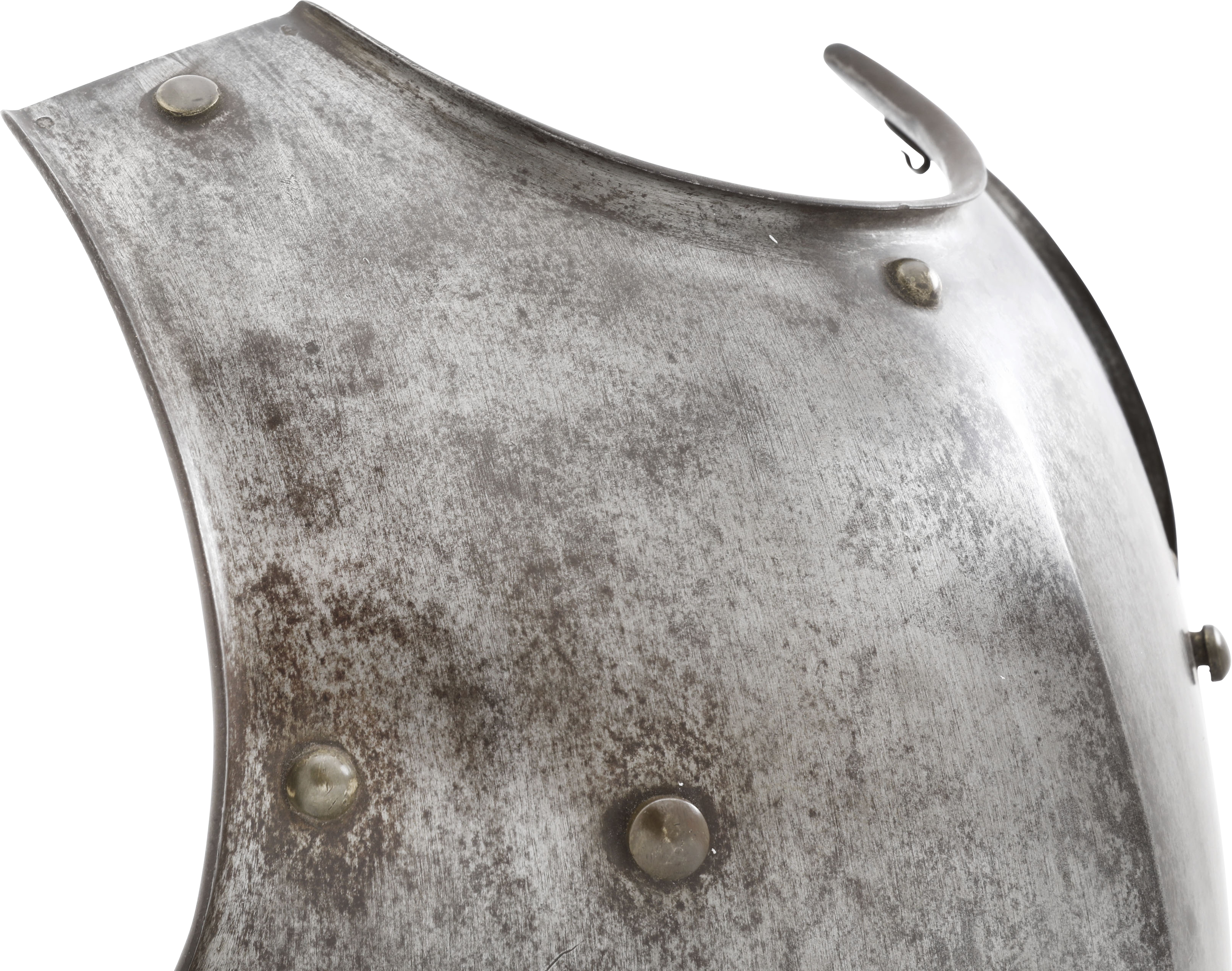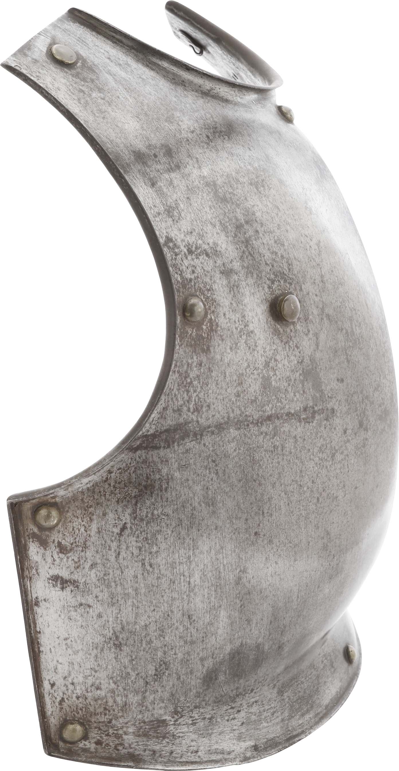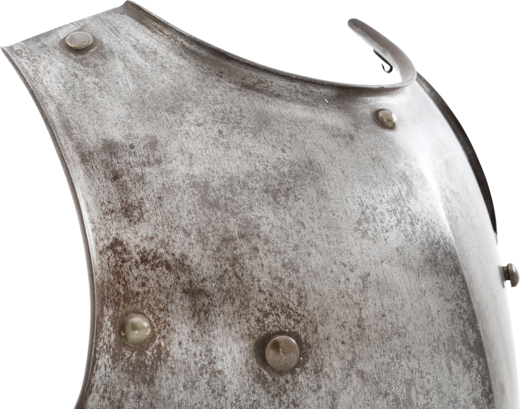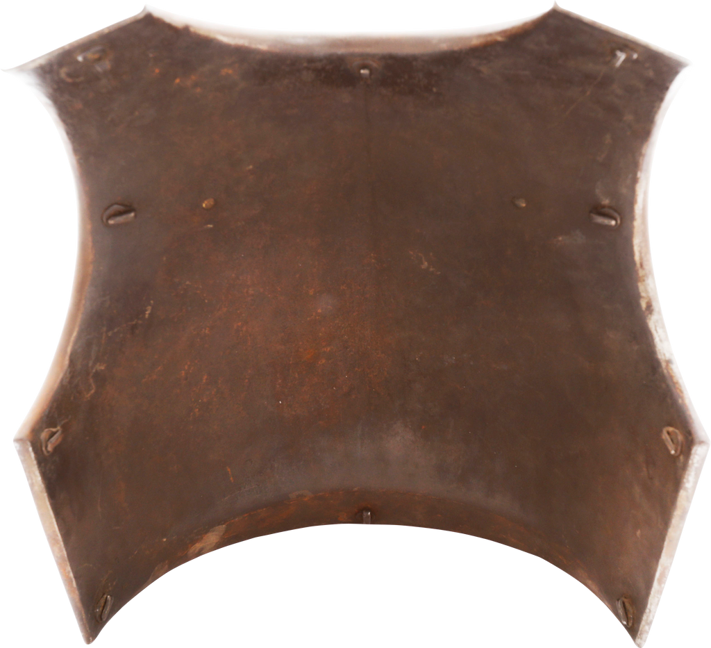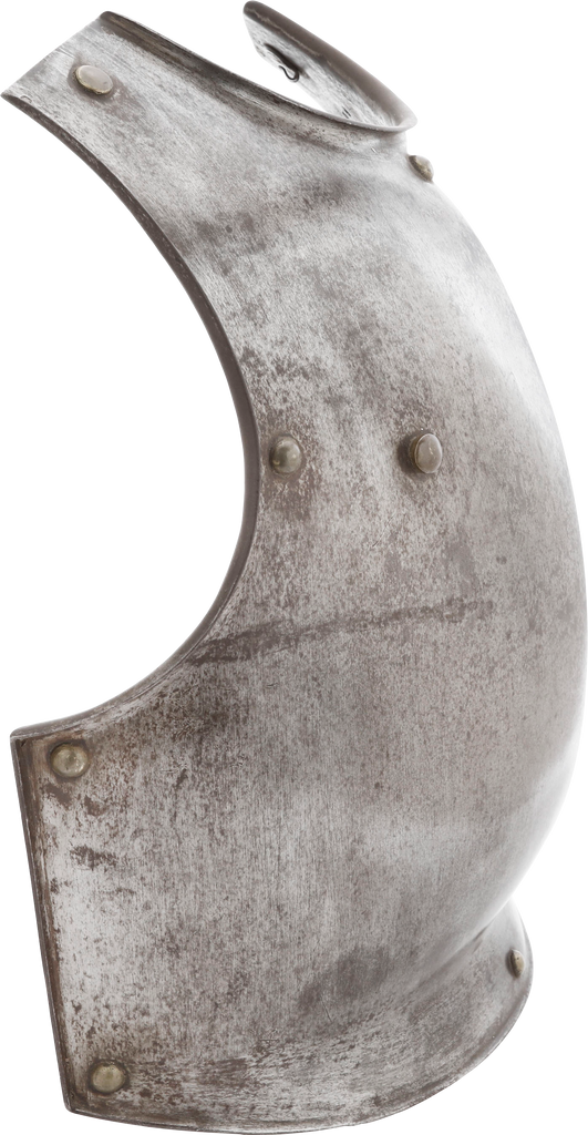 One piece forged iron, 14 pounds. Finely formed with rolled bottom edge and flared edges to the arms and neck. Forged with a drop hammer. The Inside with a distinct hammer texture. The hook mounts to the inside for securing the padded liner. The left shoulder (inside) with regimental marks and serial number. Excellent with fine glossy patina.