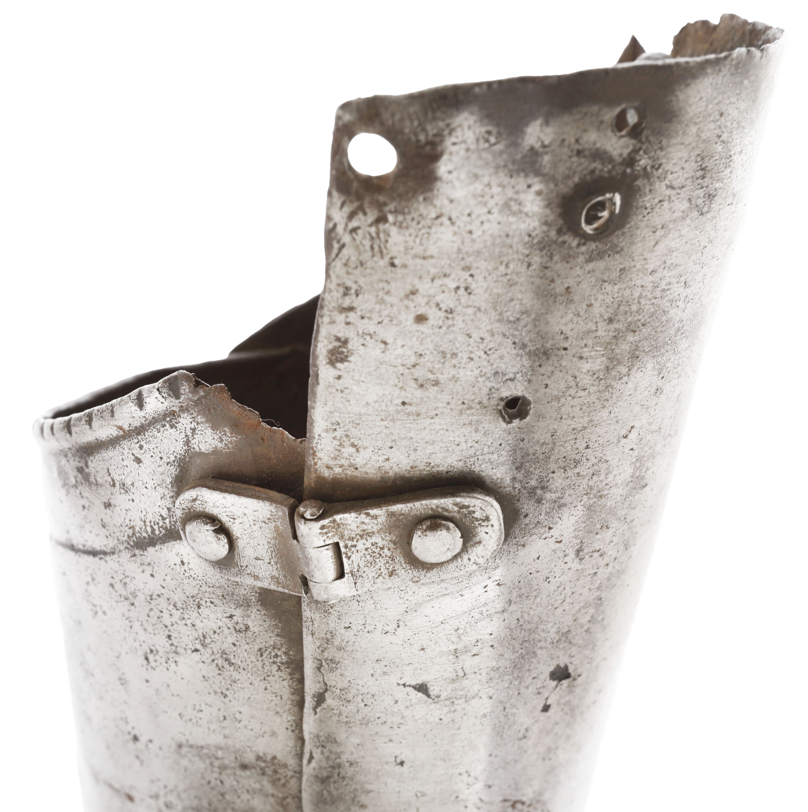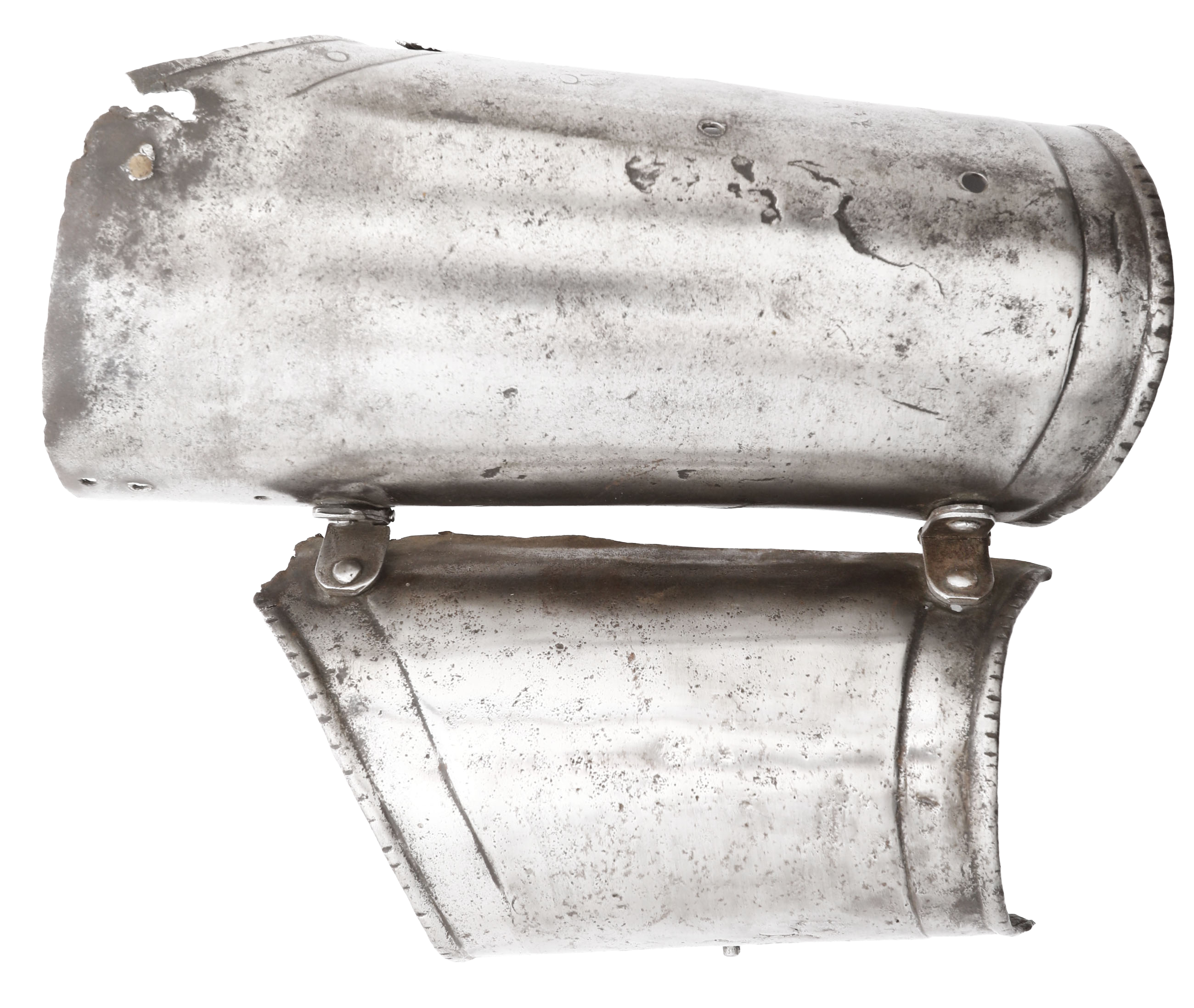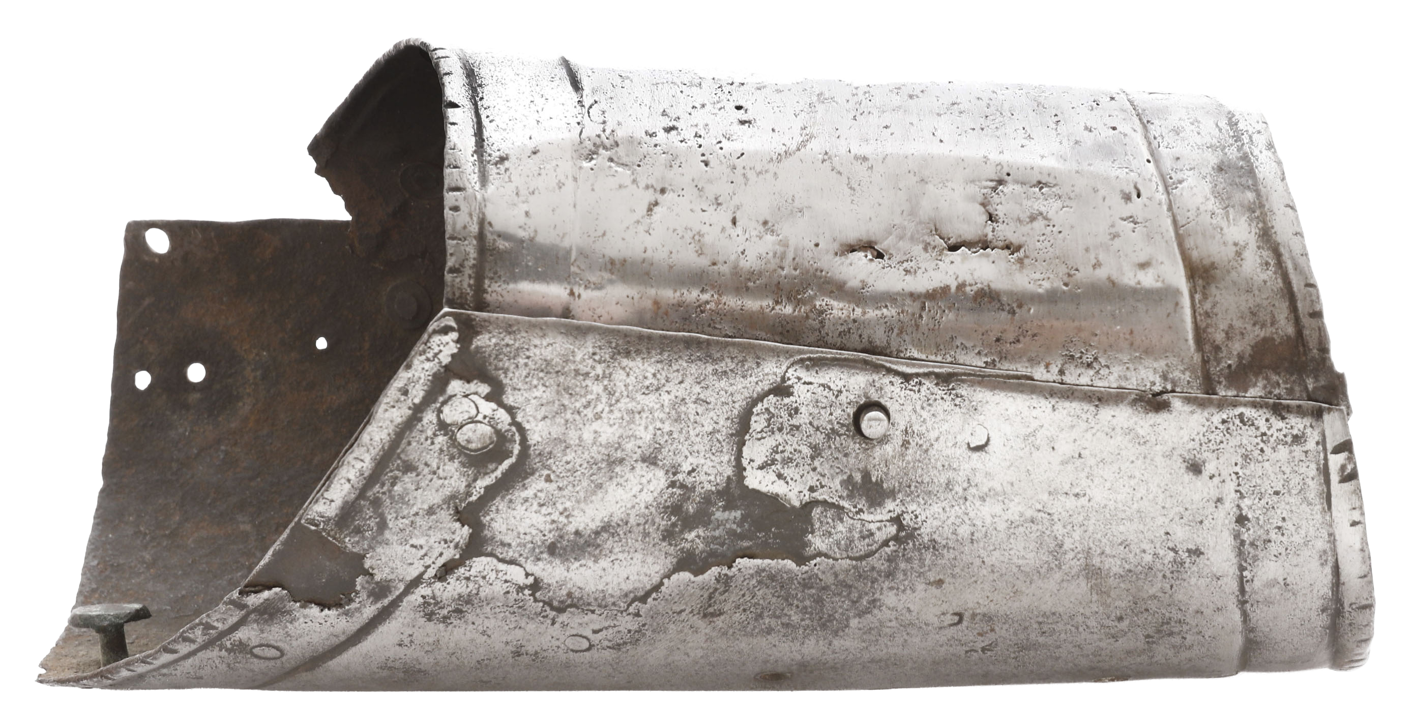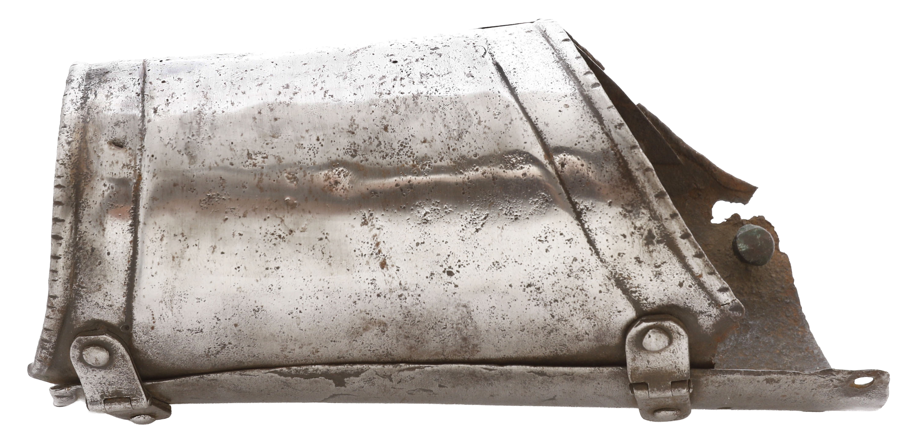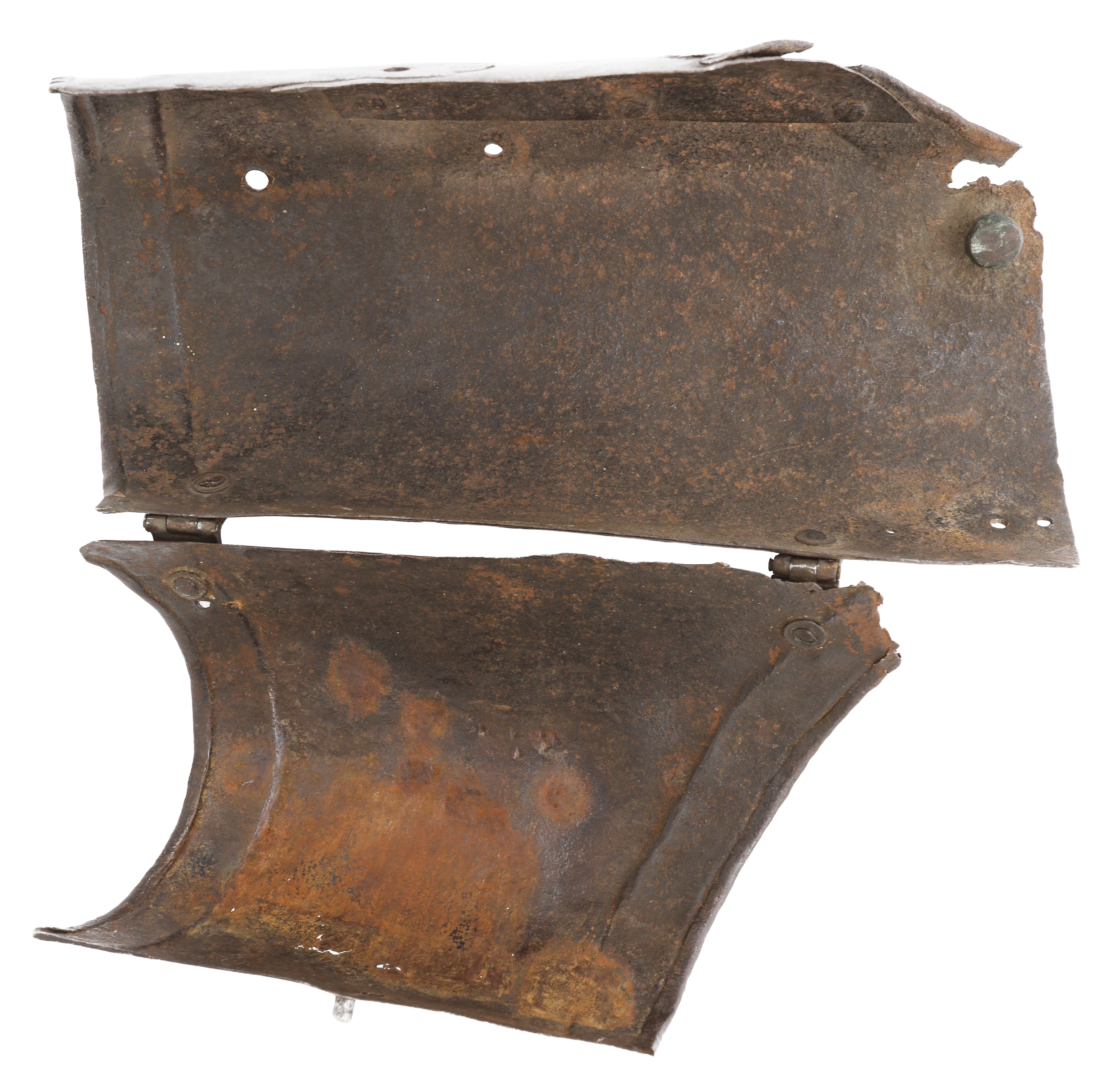 Forged iron in two heavy plates with connecting hinges and snap lock. 9” length. The upper plate with medial ridge. Both plates with rolled and roped edges and sunk borders. The upper with a working life repair plate and both with expected lamination. Ex: Higgins Armory Museum, Worcester Mass.