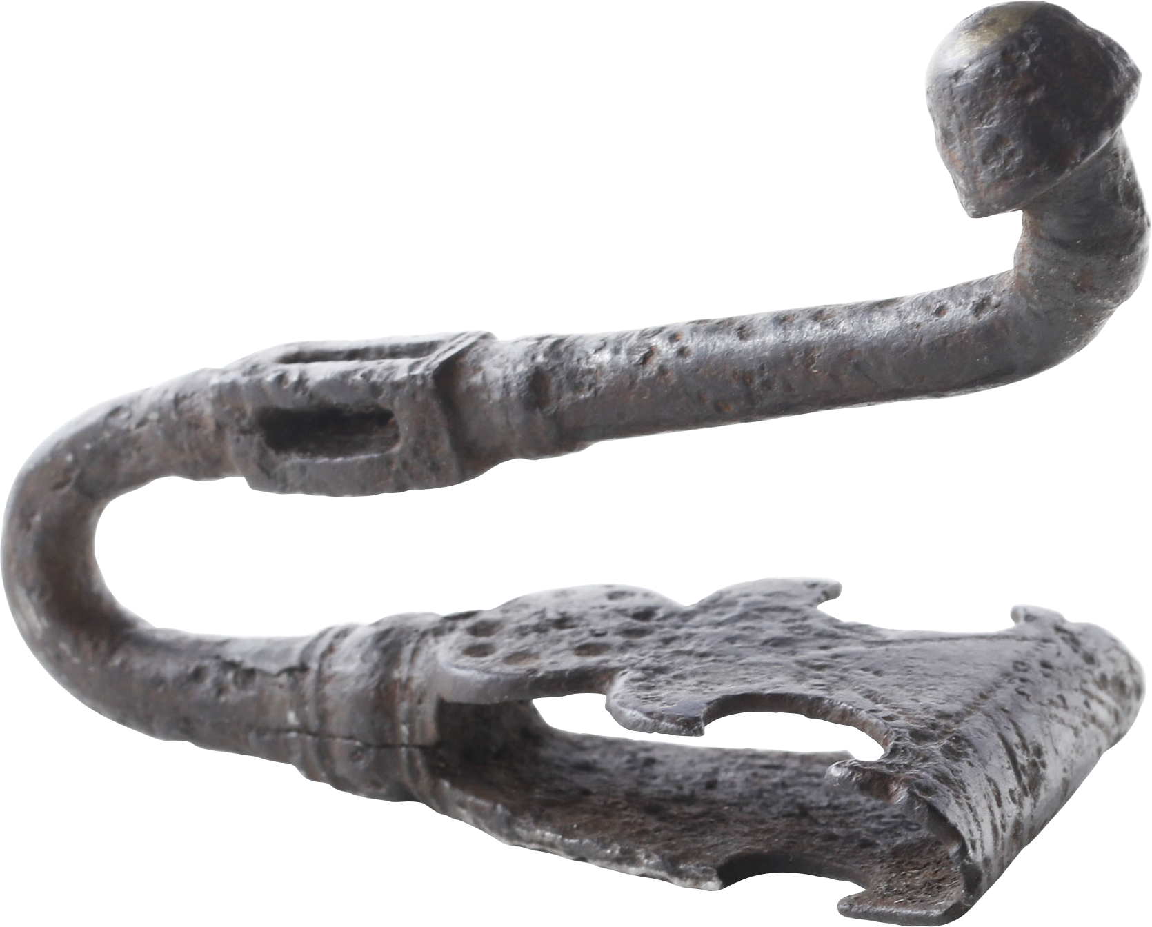 Forged iron, 3 3/8” length. Triangular loop with crescent form scallops. Tapered hook with pierced rectangular medial which engaged the scabbard suspension ring. Brass capped acorn terminal. See Metropolitan Museum 2010.180.2, online and displayed in Gallery 307, for a near identical example identified as French, 15th century. The quality suggests the accessory served a knight, probably noble, suspending a sword such as our A5986.