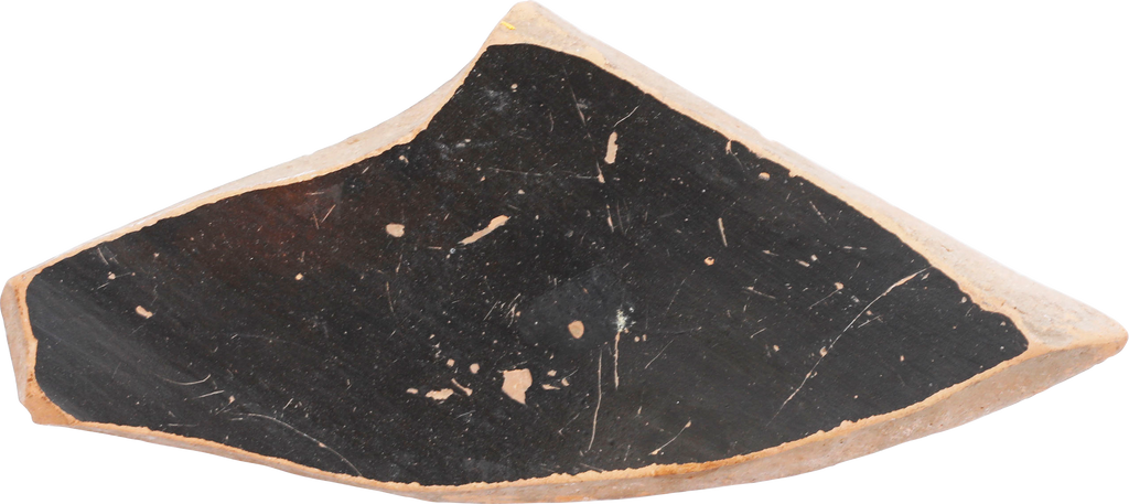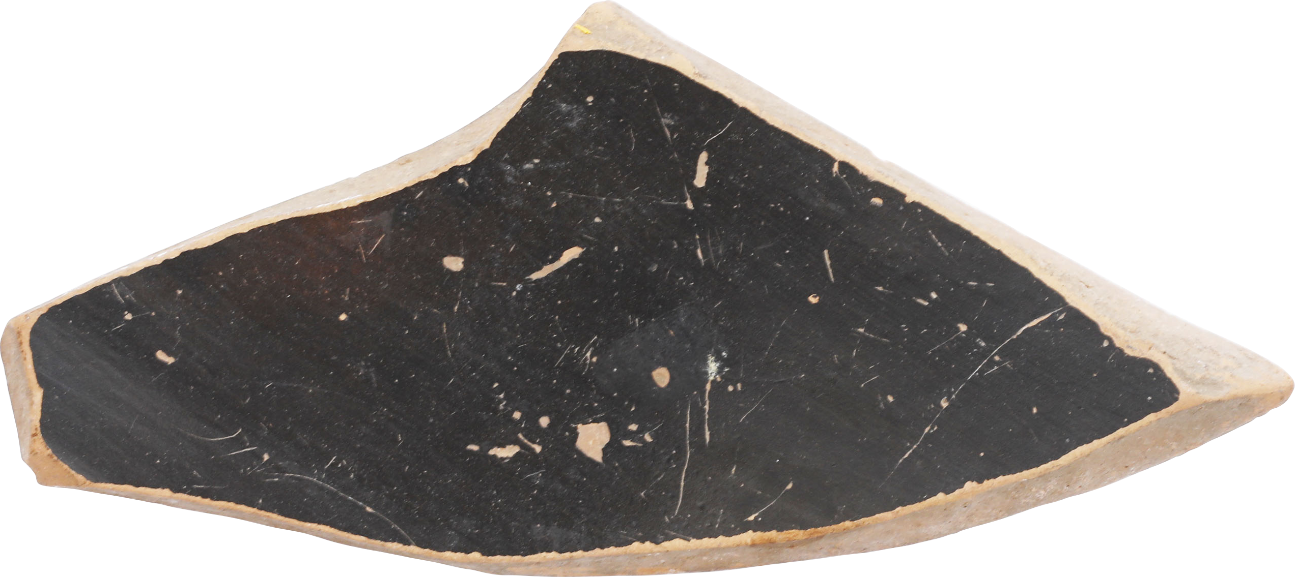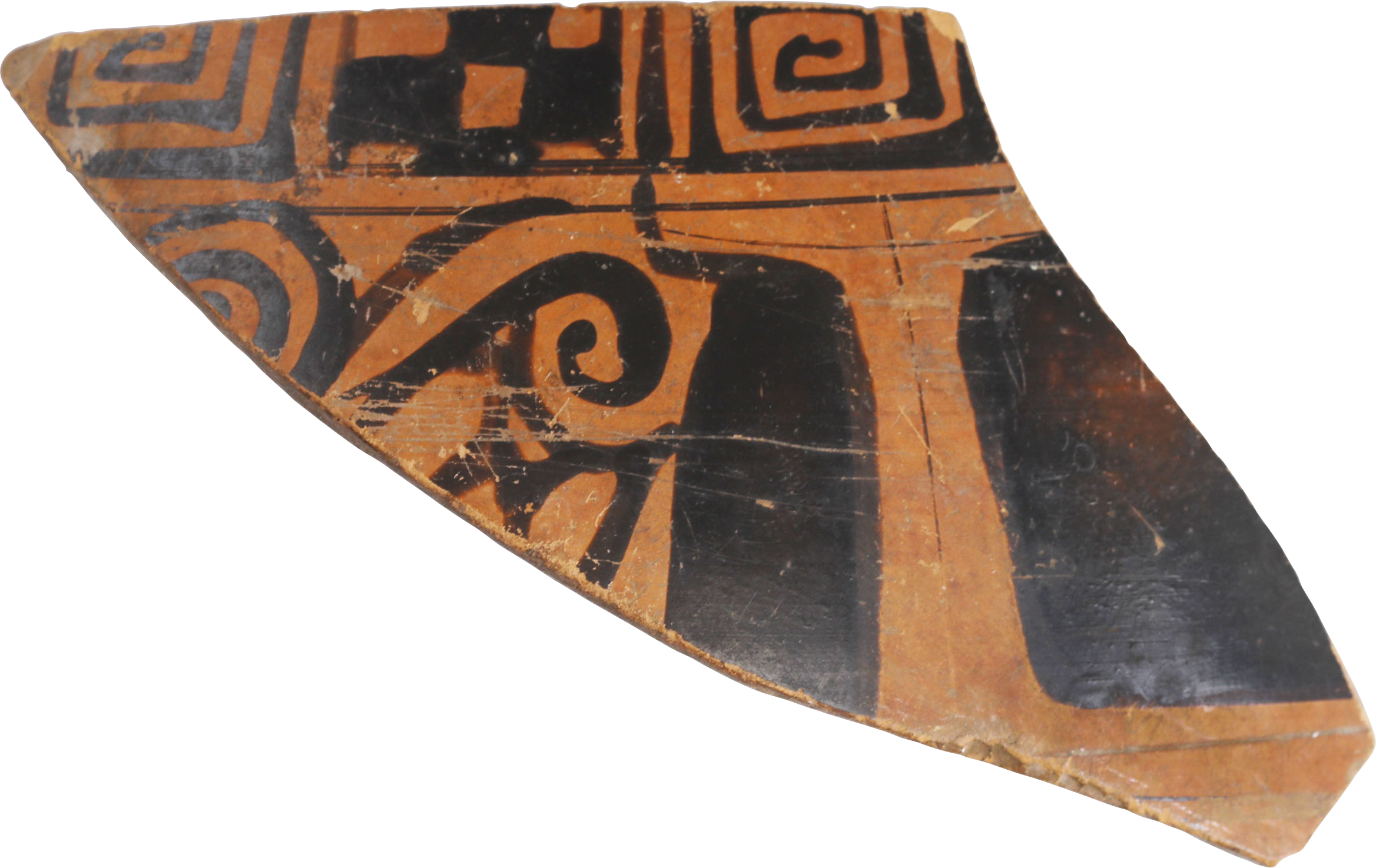 From a major vessel. 4 ¾” length, black painted decoration on polished red ware. The upper band is a variation on the Greek key with scrolling foliate forms below. A substantial fragment of a vessel which, if complete, would be valued well into 5 figures.