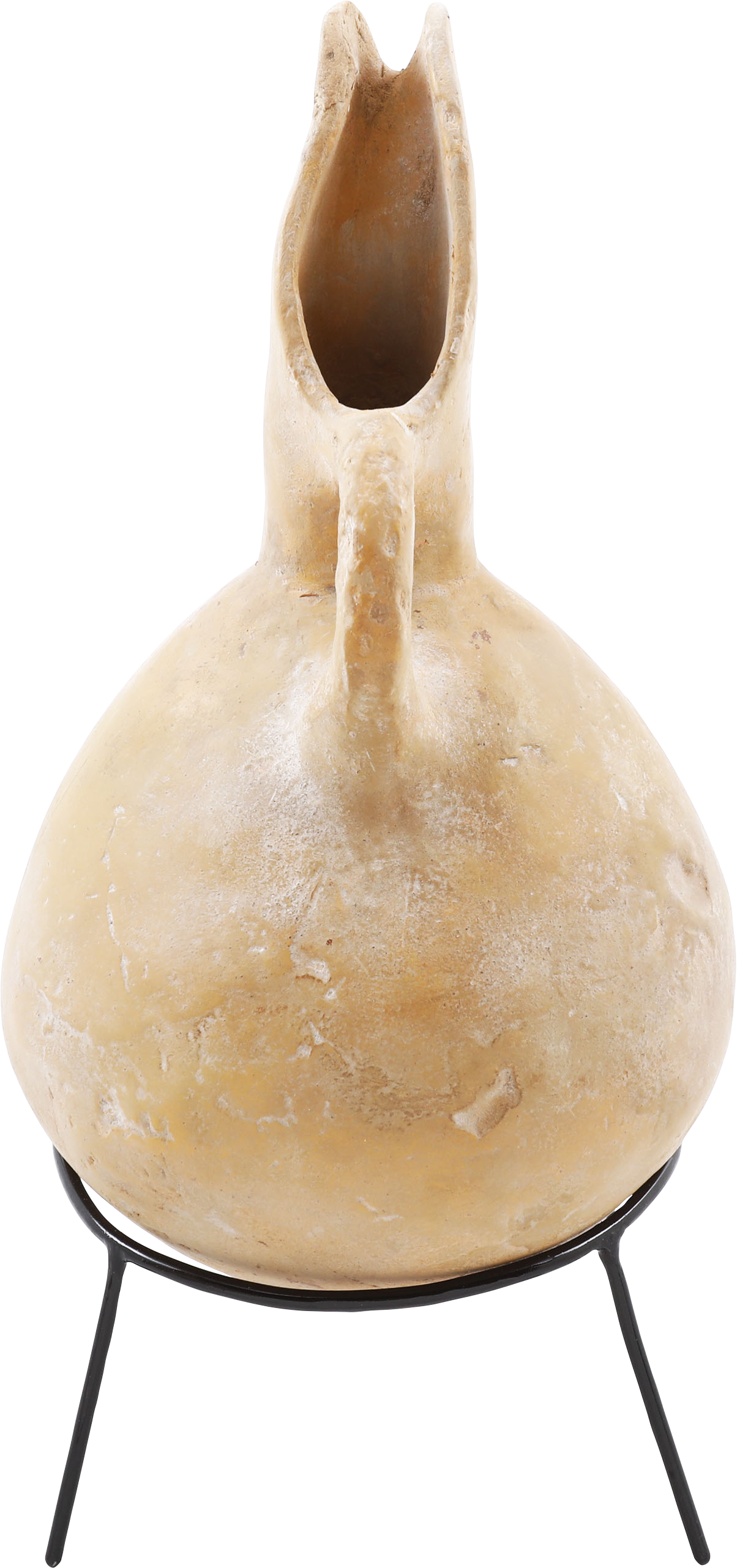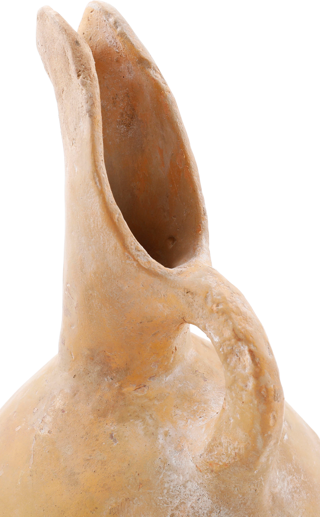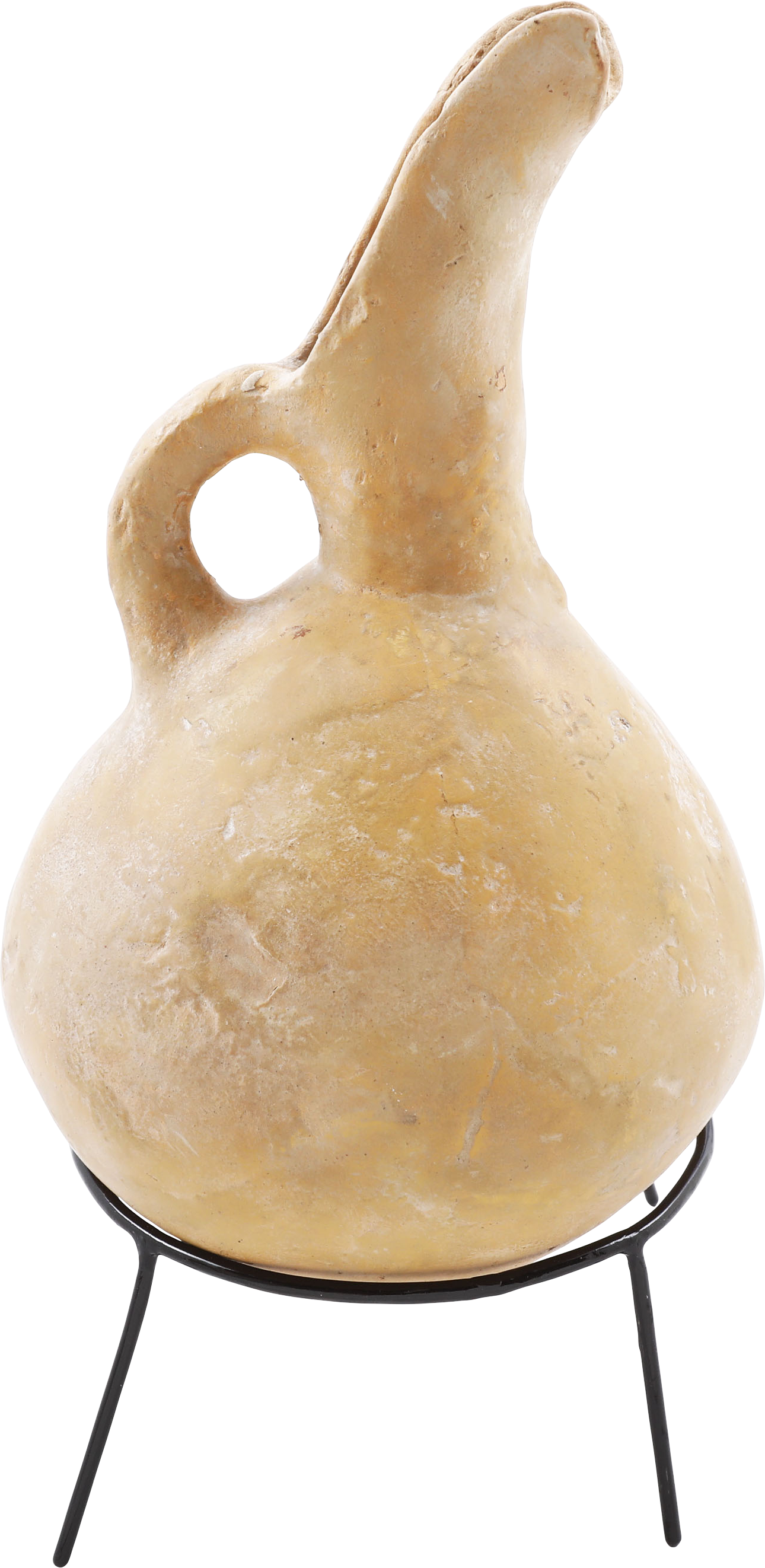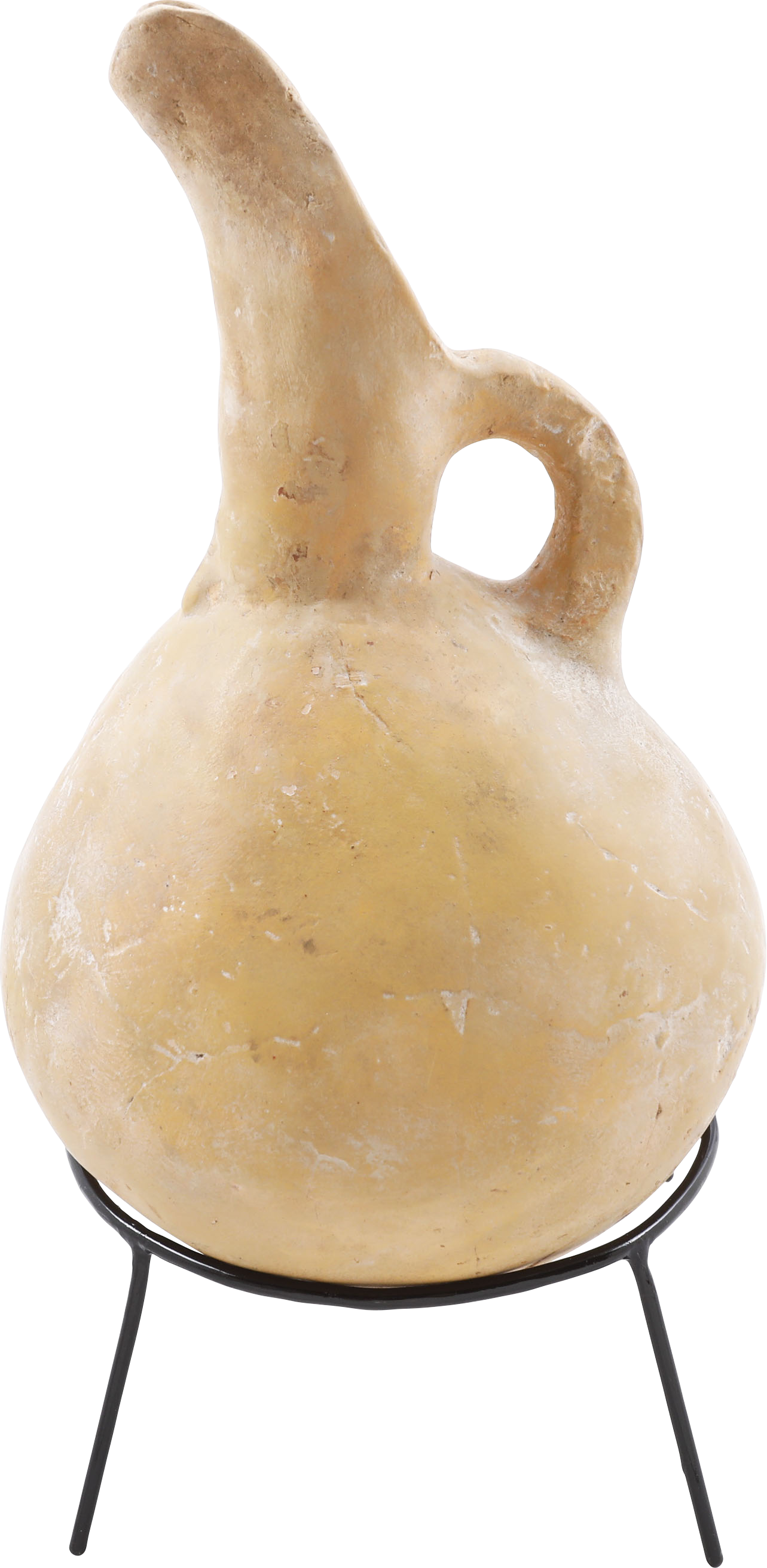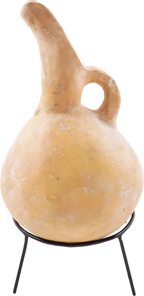 Buff terra cotta, 9 ¼” height, Inverted turnip form body with curved spot and thick strap handle. The surface with localized pock marks and the bottom with hair line cracks. Light surface encrustation from burial. A pitcher for wine or water from modern Israel or Palestine. On a modern display stand.