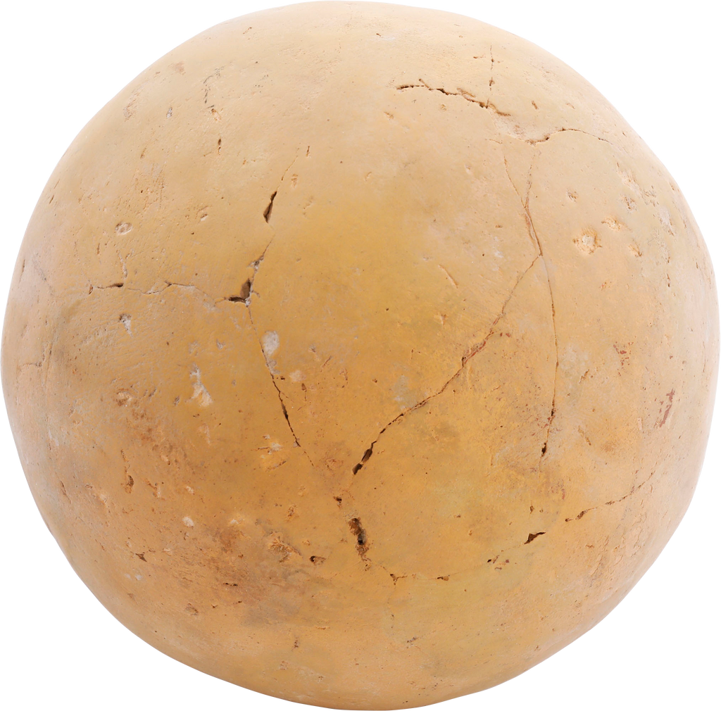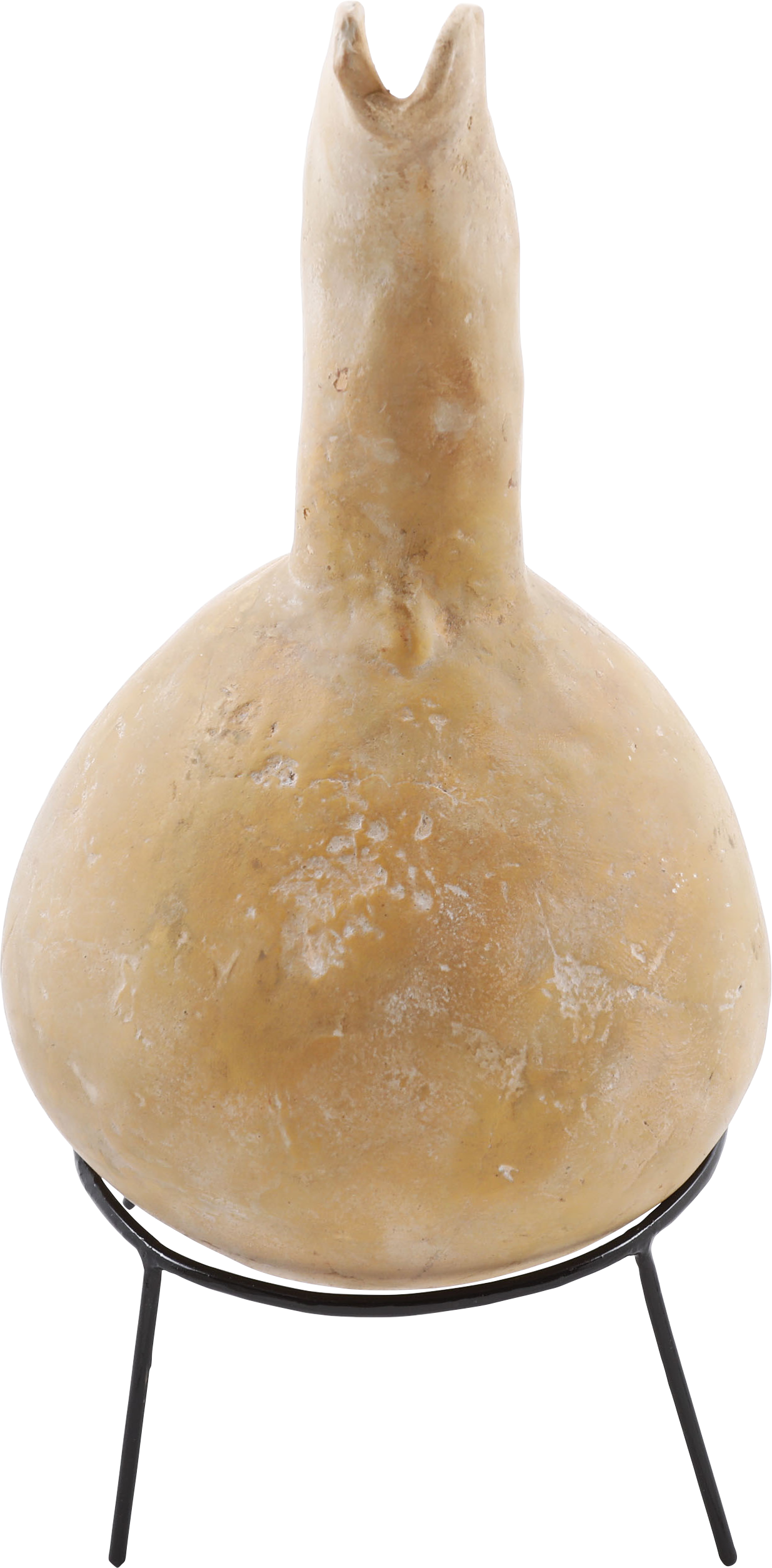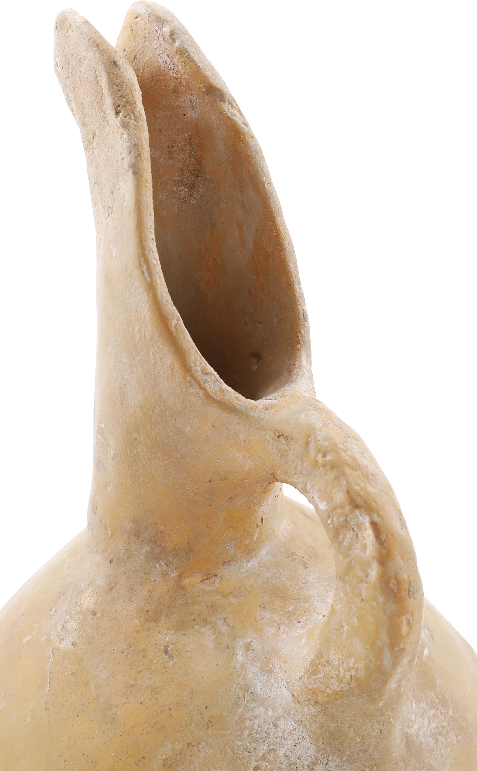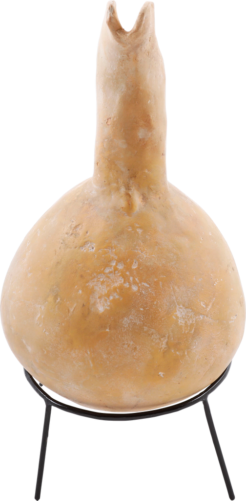 Buff terra cotta, 9 ¼” height, Inverted turnip form body with curved spot and thick strap handle. The surface with localized pock marks and the bottom with hair line cracks. Light surface encrustation from burial. A pitcher for wine or water from modern Israel or Palestine. On a modern display stand.