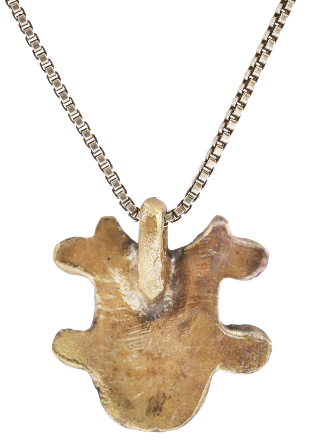 Gilt bronze, just over 1/2” (0.55”) in total height. An armorial device, shield shaped with medial ridge. The sides with four spheres. Those are references to the Medici family of Florence who incorporated five spheres, later circles on their arms. The implication here is that this is the armorial pendant of a Florentine woman of noble birth. Professionally refurbished with the 24karat gold surface restored and suspended from an 18” modern gilt sterling silver neck chain. Gift boxed with certificate of authenticity.