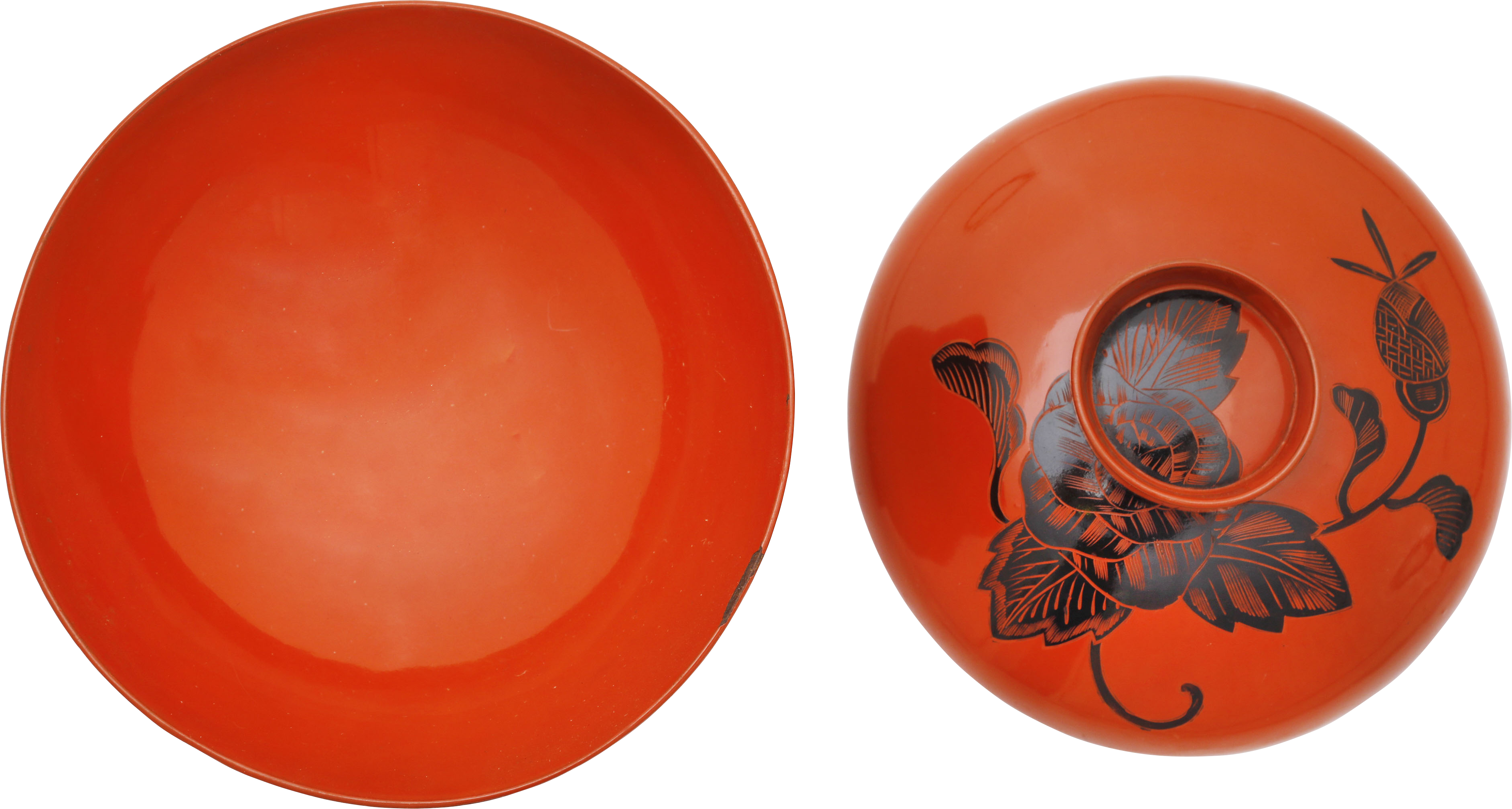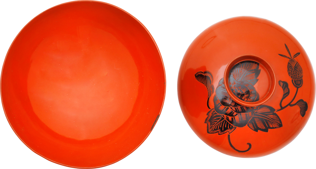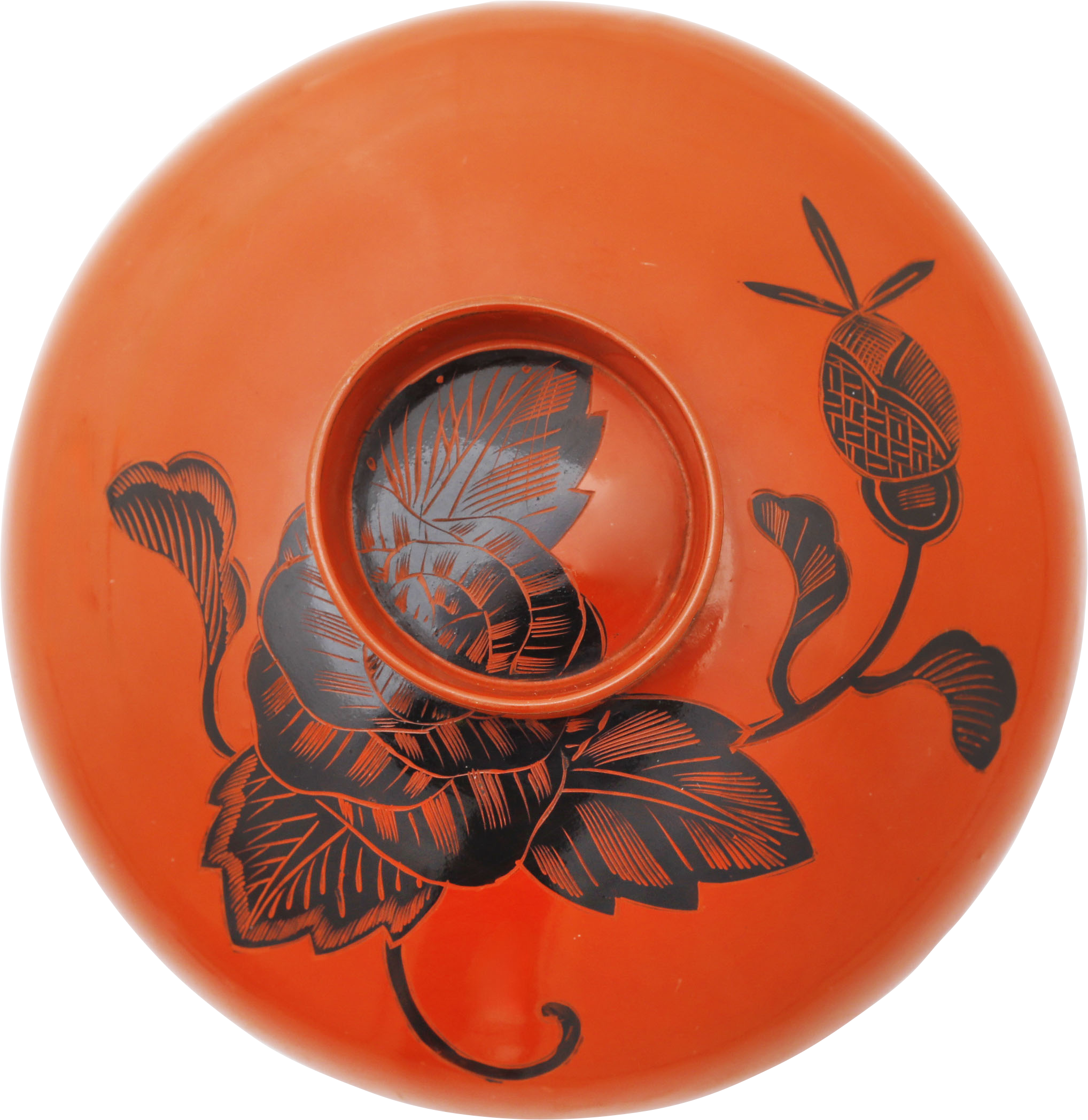 Meiji period, 1867-1912. 5” diameter, with red/orange body color. Each of the cusped medial profiles. The top decorated with a black lacquered flower and tendril, the details executed by cutting through the black lacquer into the body color beneath. That technique was popular in China. True lacquer (not paint) took weeks of drying for each coat and months to produce this bowl. Small chip to the lid edge, otherwise fine preservation.