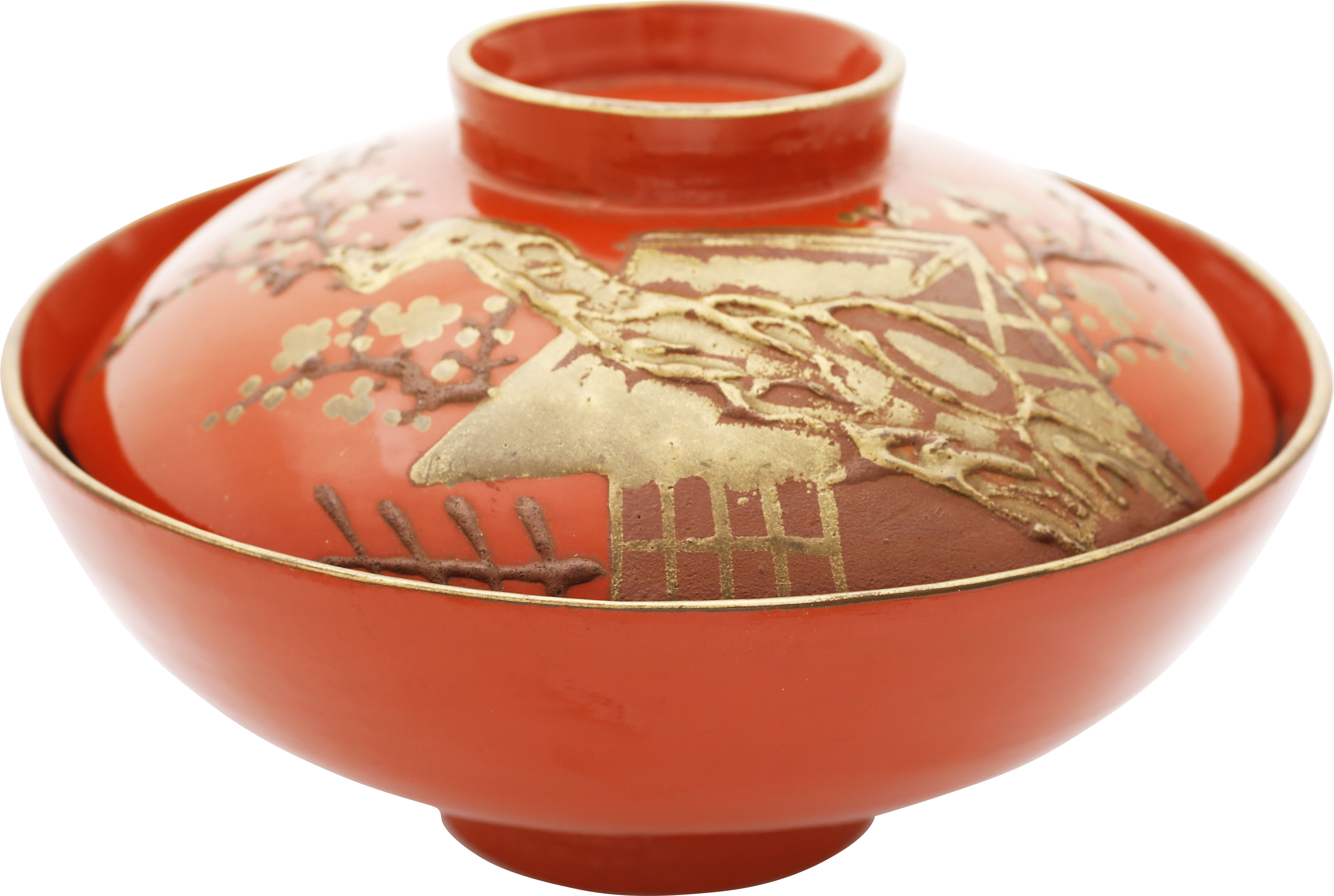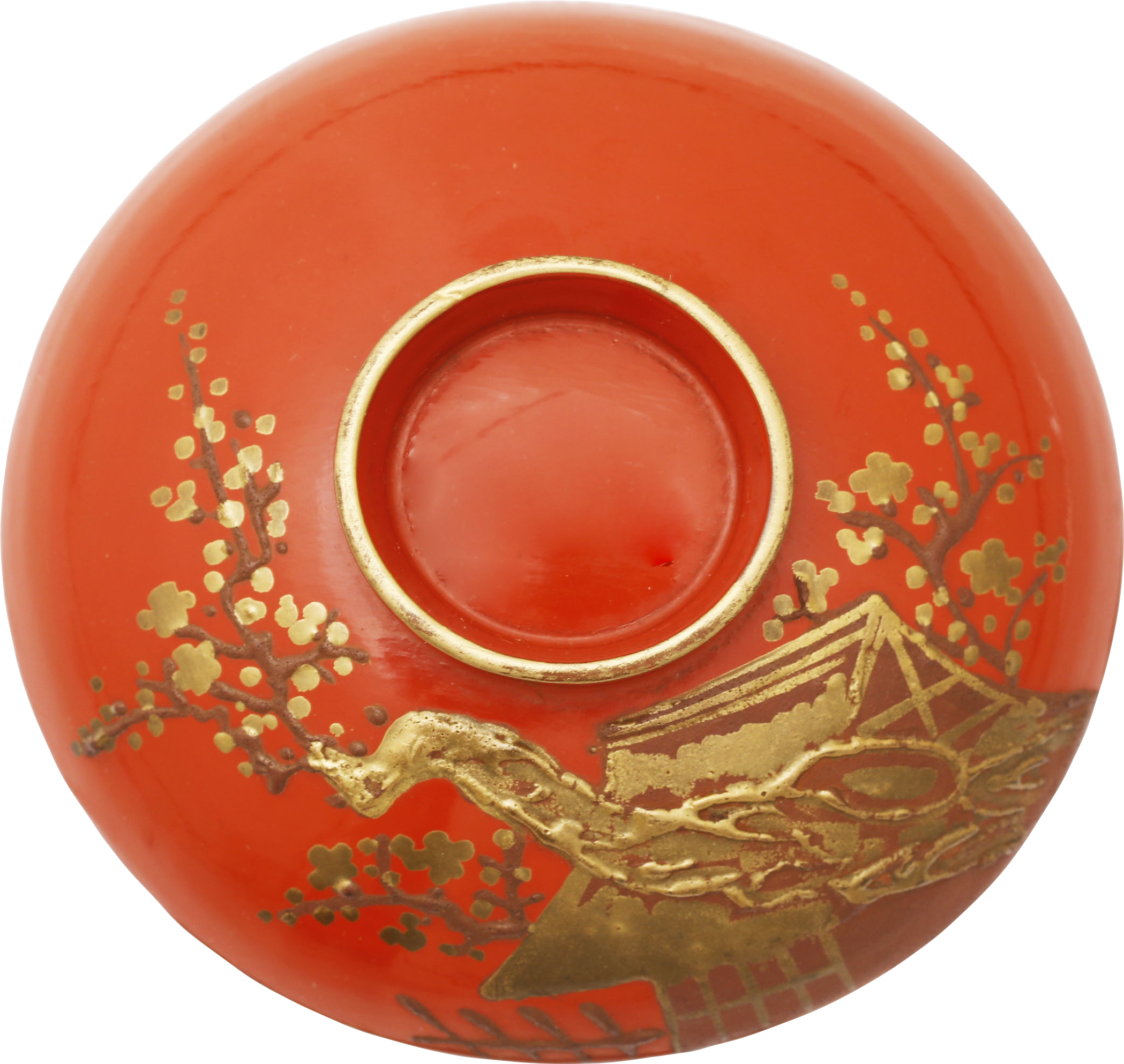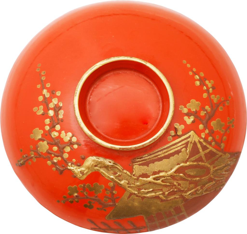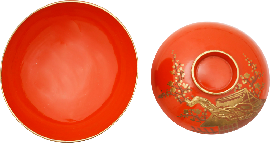 For soup or rice. Meiji C.1867-1912. 5" diameter. Both of rounded form. Tapered grip and foot. Red/orange color throughout. The grip and lips gilt. The top with profuse scene of a thatched roof house behind a gnarled tree sprouting new branches and foliage. The whole in particularly heavy gold, built up to near true relief. All gold decoration is true gold in a lacquer matrix. Produced by the true lacquer (not paint) process which takes months of layering and drying. Additional details to the purchaser. Excellent.