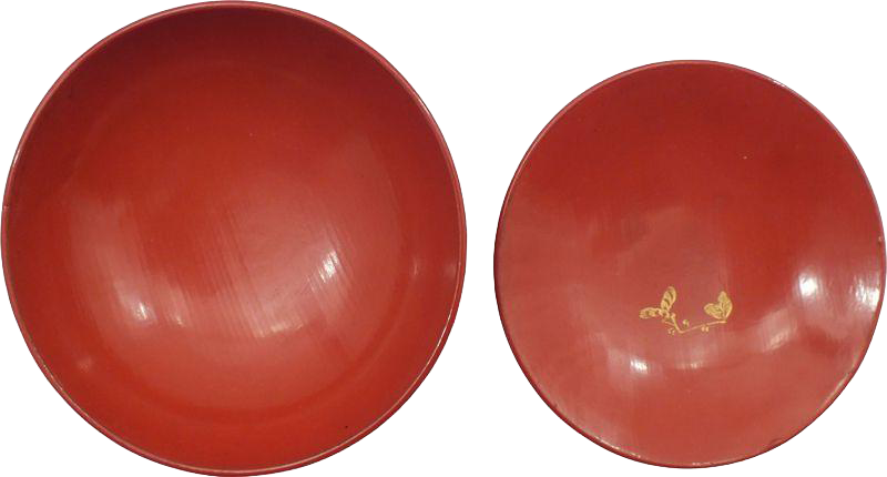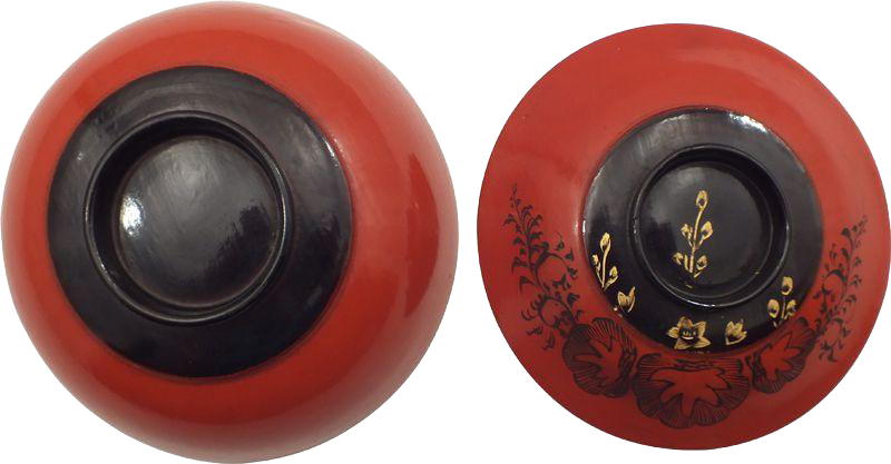 Meiji Period, 1867-1912. 4 3/4" diameter. Rounded with short steps to the top and bottom. Cylindrical foot and grip. Orange body color with black circular panel to the top and bottom. The top with gold flowers and foliage within the circle. The top, outside the circle, is decorated with foliage and flowers cut through the surface to the black undercoat. That work is in imitation of Chinese cut lacquer. The inside of the top with sprigs of gold foliage. Excellent with the wood grain reflected in the finish, attesting to its age.