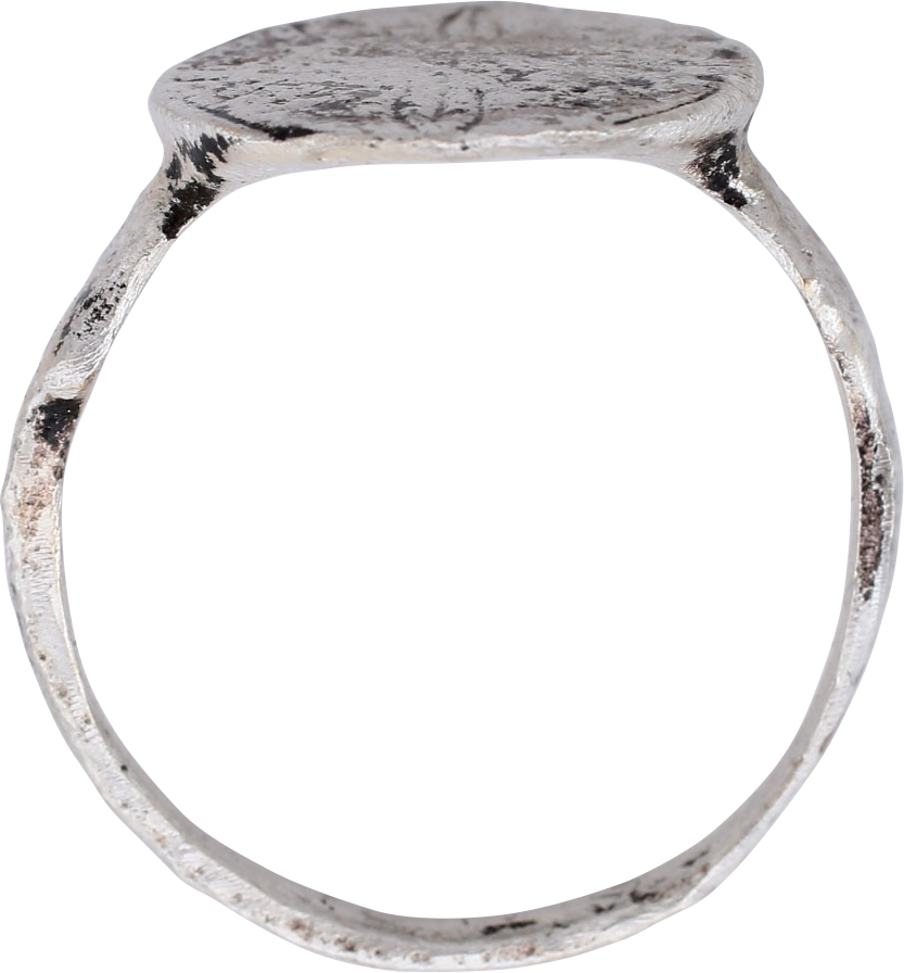 Silvered bronze, 15th-17th century, size 10 1/2 with 2.6mm rounded face band with diamond shaped shoulders and circular bezel engraved with a quatrefoil surmounting a saltire. See Ancient Rings, Pollio, p.30.  Professionally refurbished with pure silver surface restored. Jewelry gift boxed with certificate of authenticity.
