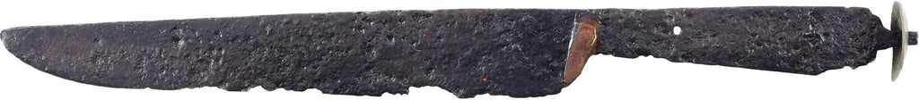 13th century. Forged iron with 6” wedge section blade. The base with applied brass crip caps, specific to C.1225 AD. Tapered tang for pinned scale grips now lacking. One pine remaining and one missing. Heart shaped brass pommel cap. A weapon, indicated by the fact that is has not been repeatedly sharpened as were work knives. Well preserved for the period.