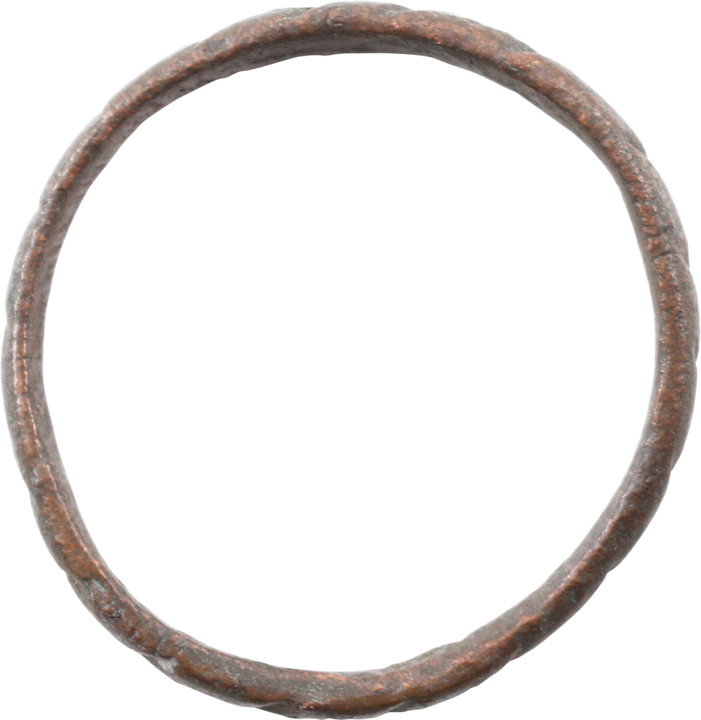 Copper, size 9 ¼, 2.7mm width with hand cut roped rounded face. As found condition with rich patina and good detail. A peasant’s ring hand decorated by its owner.
