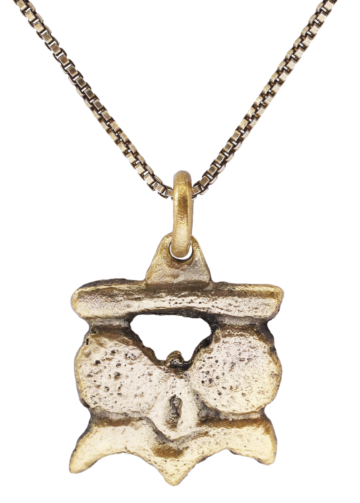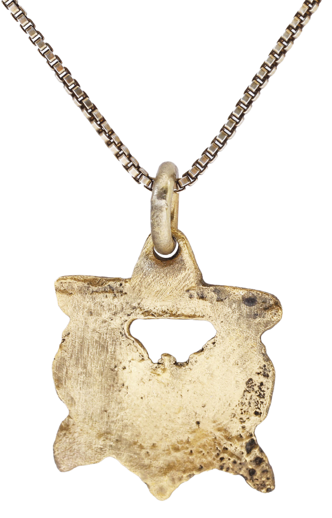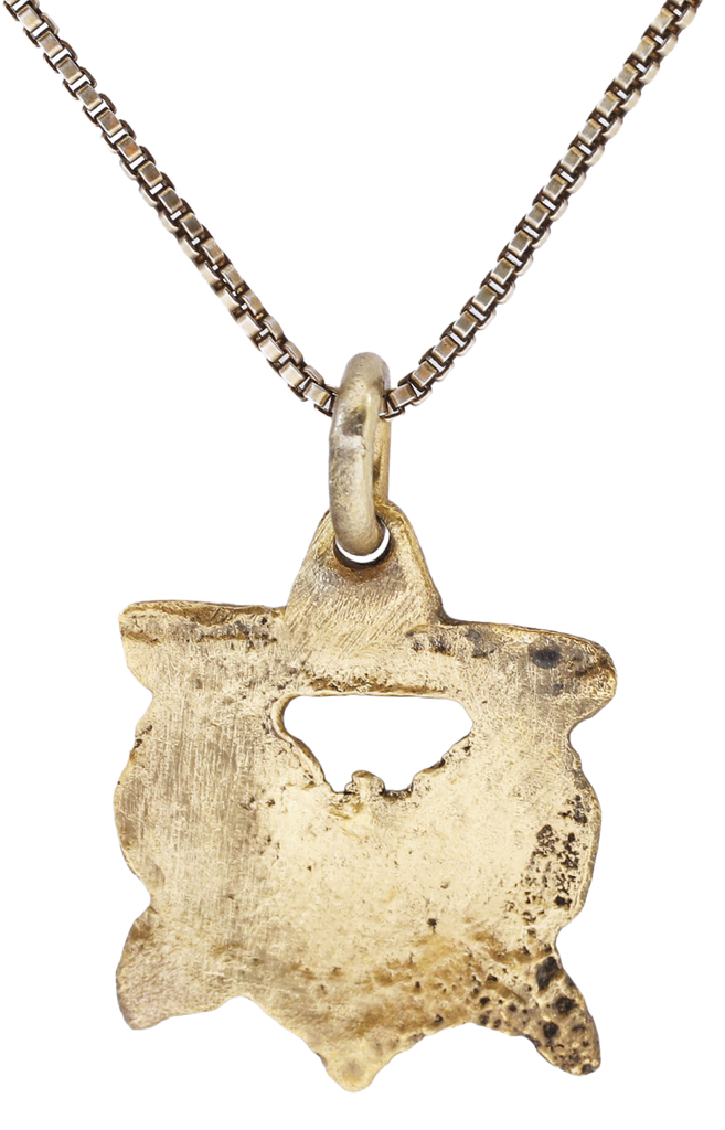Gilt bronze, over 1/2” width (0.56”) of a high relief pair of circle over crescent motifs, likely referring to the ancestral achievements during the Crusades. Made by the open face mold technique with 24karat gold surface on an 18” gilt silver neck chain for modern wear. Probably French.