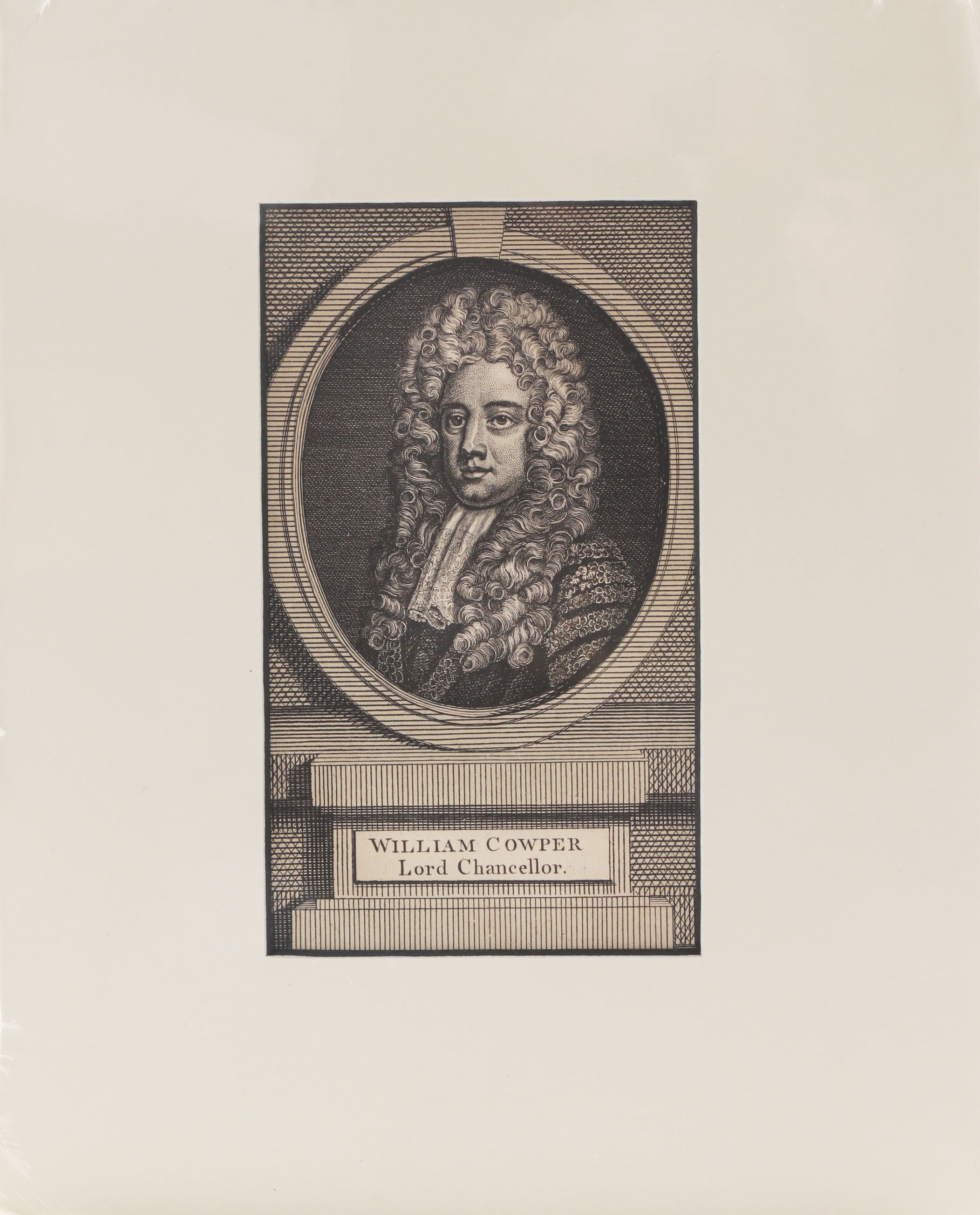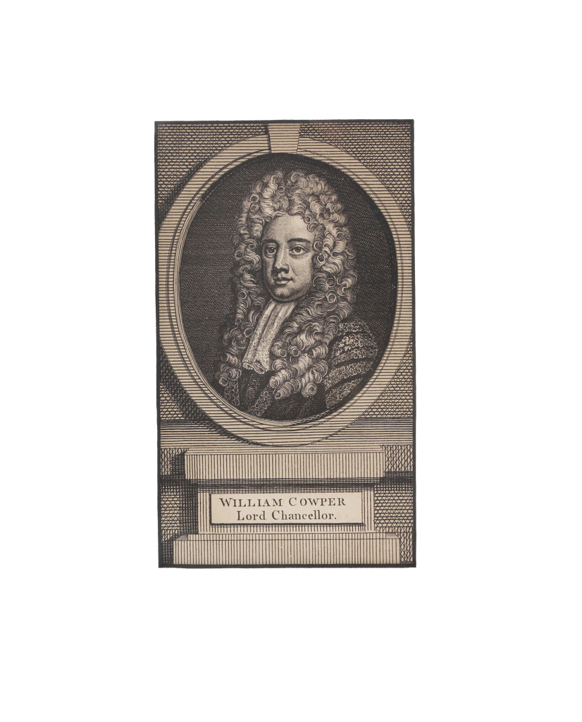 3 ½” x 6” original c. 1780  lithograph  William Cowper, 1st Earl Cowper (1665–1723), Lord High Chancellor of Great Britain  from 1705 to 1710 under Queen Anne, and again from 1714 to 1718 under King George I. Cowper was the first to hold the title of Lord Chancellor of Great Britain following the Acts of Union 1707, which united England and Scotland.  Finely engraved and professionally matted to 8” x 10” for an off the shelf frame from Michael’s, Walmart etc. Genuine 250 year old original.