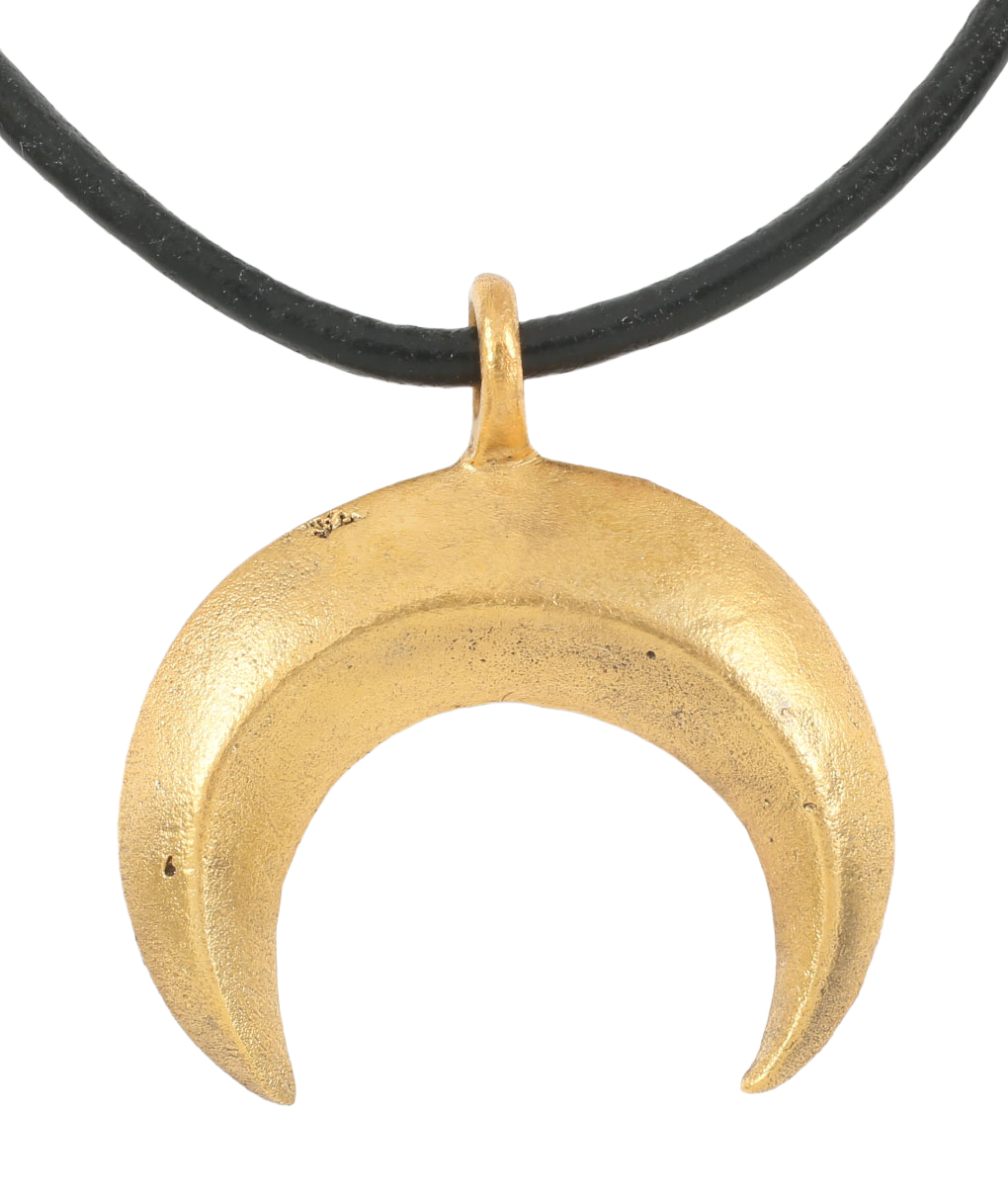 Gilt bronze in the form of a crescent. Over 1” (1.06”) width. Made in two pieces fuse together with hollow interior, The front boldly ridged and the back flat Suspension loop with modern Gilt mounts on polished leather 18” neck cord. Original heavy gold surface with fine patina.