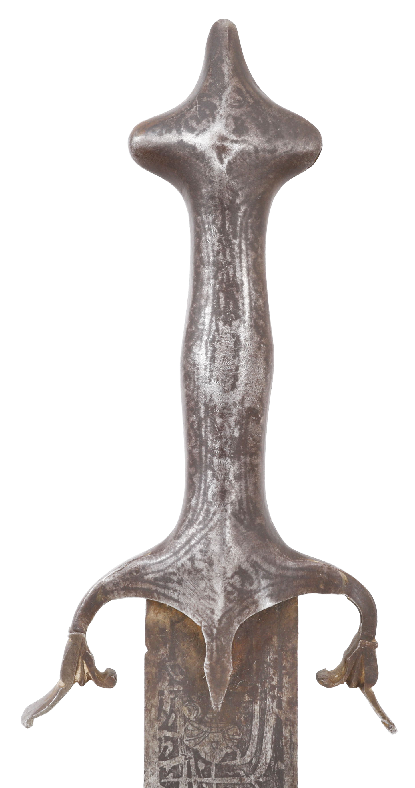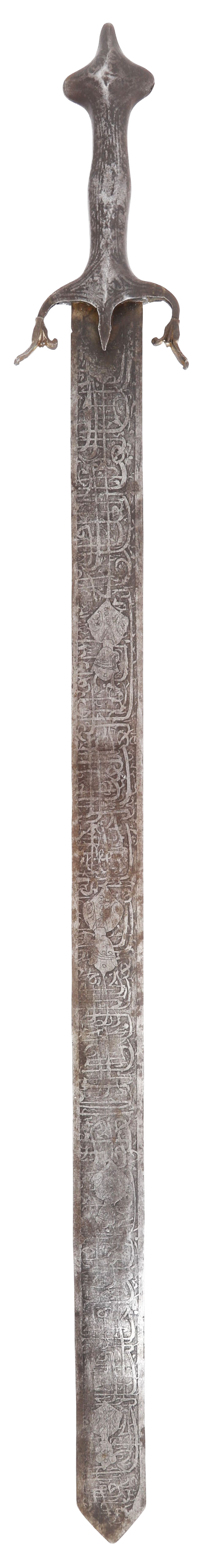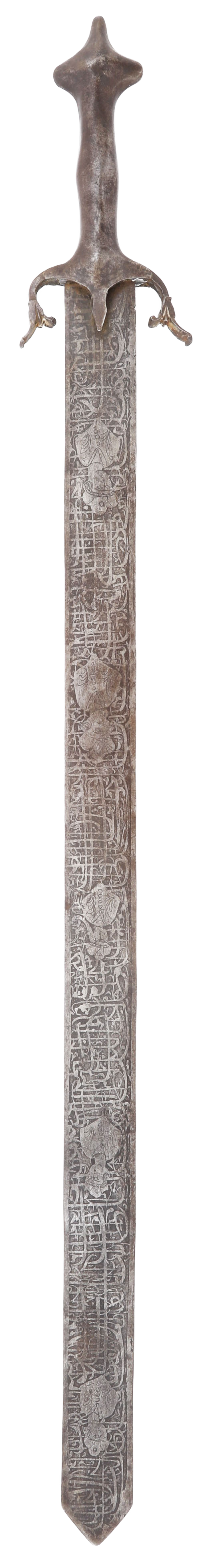 Iconic example of this rare type which are dated variously from late 18th century to mid 19th. 28” broadsword blade, replicating the 15th century originals. Decorated with five portraits of nobles each side on a background of thicket made up of stylized thuluth calligraphy. Elaborately shaped iron hilt with cross form pommel and monster form quillon terminals. This example with remnants of silver decoration on both sides. The silver worn and the pommel with a dent each side, probably from ritual use. At least one reference states that these are made with undecorated hilts and we found only one other with decoration, further distinguishing this example.