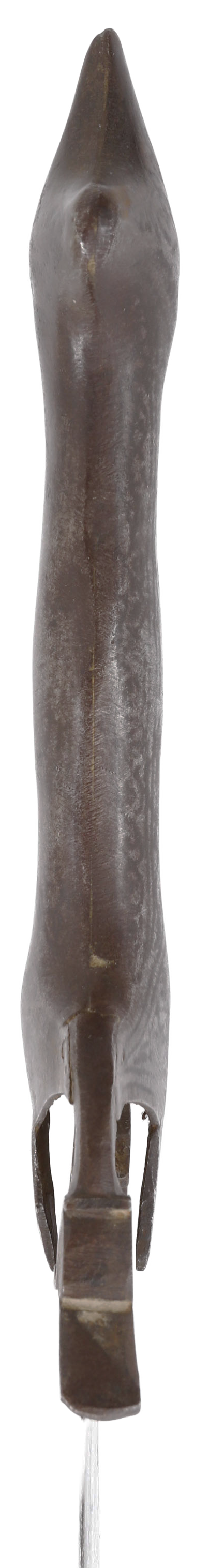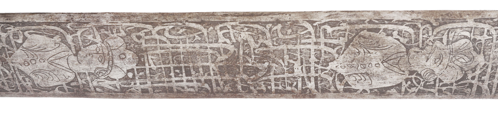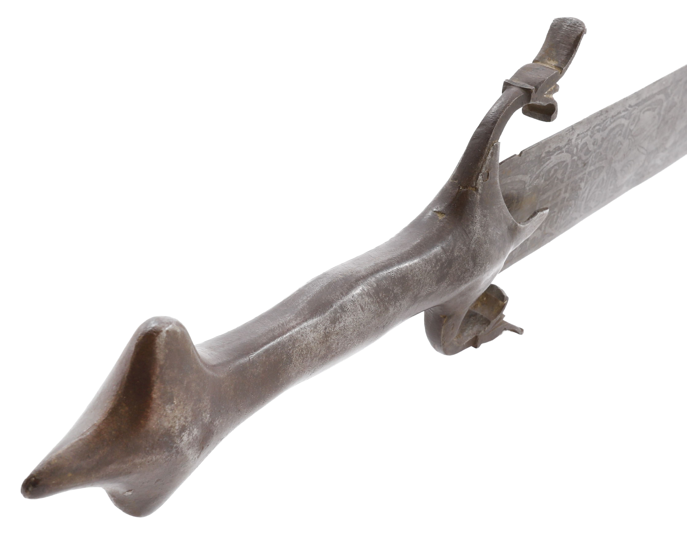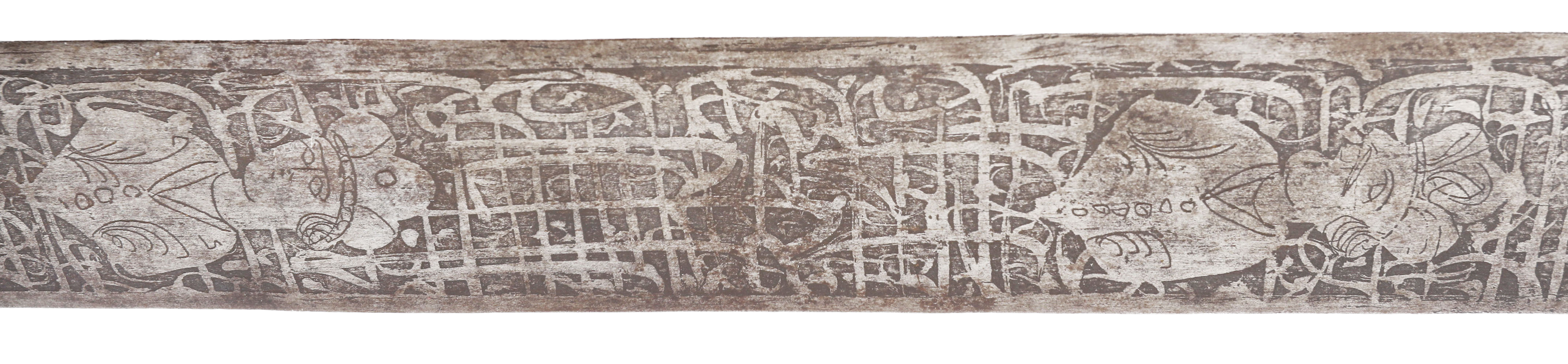 Iconic example of this rare type which are dated variously from late 18th century to mid 19th. 28” broadsword blade, replicating the 15th century originals. Decorated with five portraits of nobles each side on a background of thicket made up of stylized thuluth calligraphy. Elaborately shaped iron hilt with cross form pommel and monster form quillon terminals. This example with remnants of silver decoration on both sides. The silver worn and the pommel with a dent each side, probably from ritual use. At least one reference states that these are made with undecorated hilts and we found only one other with decoration, further distinguishing this example.
