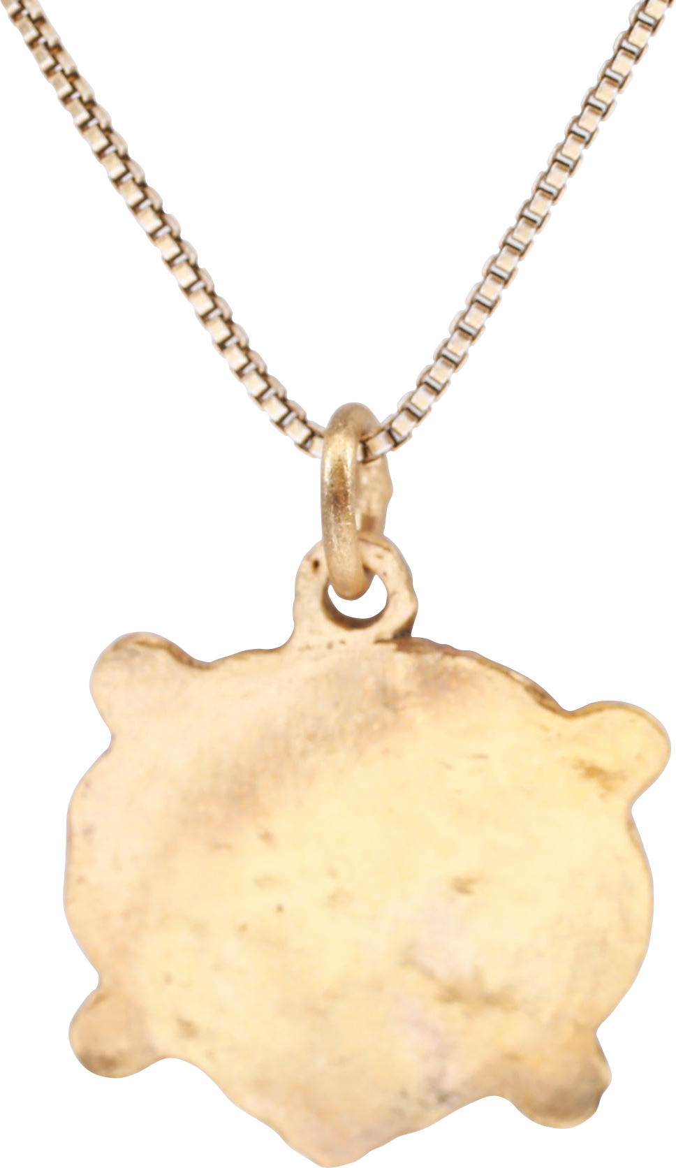 Natural heart form. About 3/4" (0.78”) total height. Central pelleted edge heart with engraved details surrounded by scrolls with nubs at the quarter points. The heart stood for bravery, fortitude, loyalty, integrity, all attributes of the Viking warrior. It is abundantly referenced in Viking literature. Excellent preservation. Professionally refurbished with the 24karat gold surface restored on an 18” gilt sterling silver neck chain for modern wear. Gift boxed with certificate of authenticity. Especially complex and finely crafted.