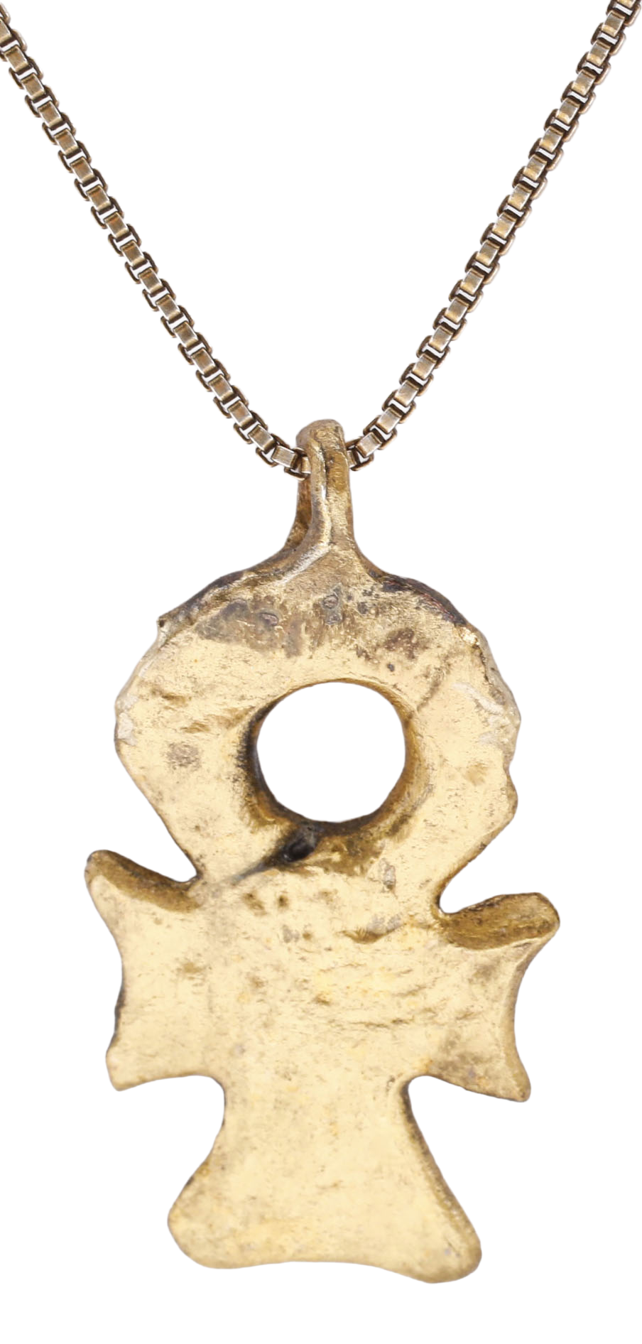 Based on the Ancient Egyptian underworld symbol, the ankh, the crux ansata signified life and eternal life. It is a cross with a loop or handle top said to represent a sandal strap. It was used with talismanic significance in art, particularly textiles. Its use as an amulet as here, is quite rare. This example is over ¾” high (0.84”) plus the loop with some surface texture from burial.  It has been professionally refurbished with the 24karat gold overlay restored and mounted on an 18” gilt Sterling silver neck chain, for contemporary wear. Gift boxed with a certificate of authenticity.
