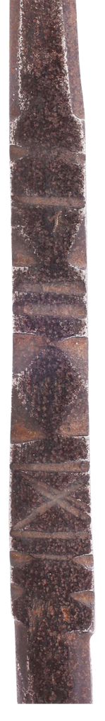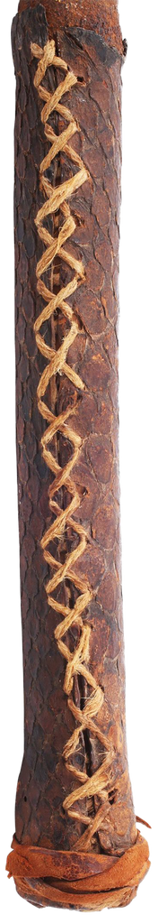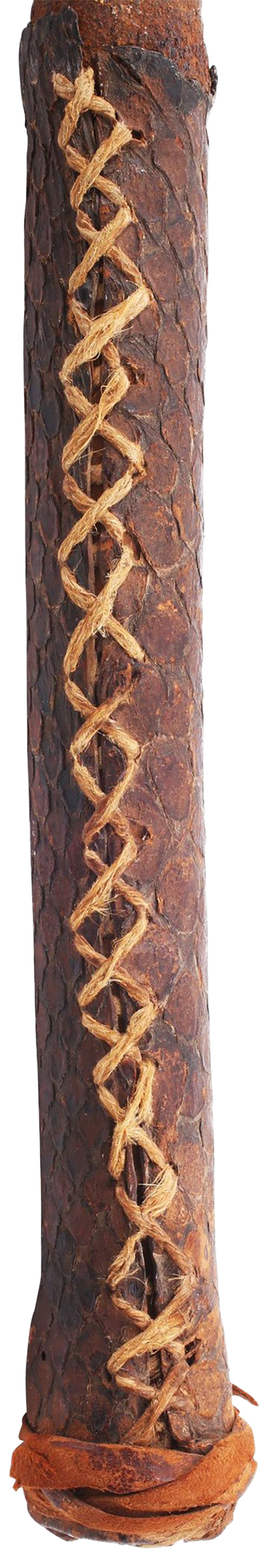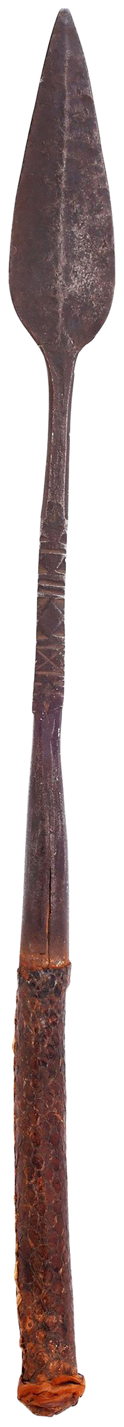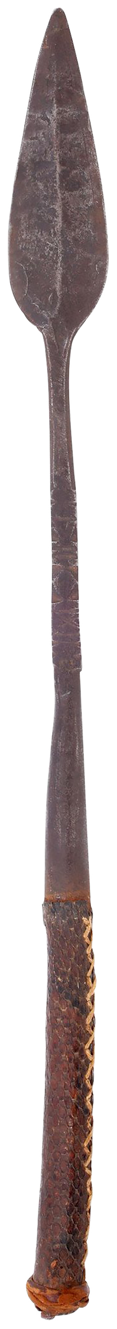 Mahdist War C.1885. 20 1/4” total length with well forged head. Medially ridged leaf shaped point over decoratively chiseled bolster. Butted seam conical socket and cylindrical reptile skin covered grip with expanded butt. Untouched with good aging throughout. The iron brown and the skin intact and complete.