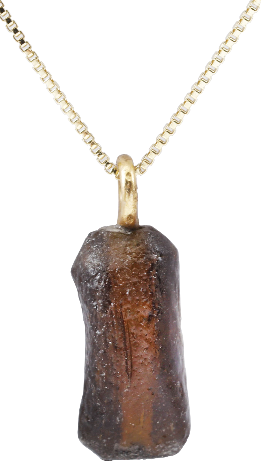 A short segment of a Roman woman’s glass bracelet or bangle of the late Imperial period. Over 1/2” length of dark amber hand wound glass. Suspended from an 18" gilt Sterling silver neck chain for modern wear. Gift boxed with certificate of authenticity.