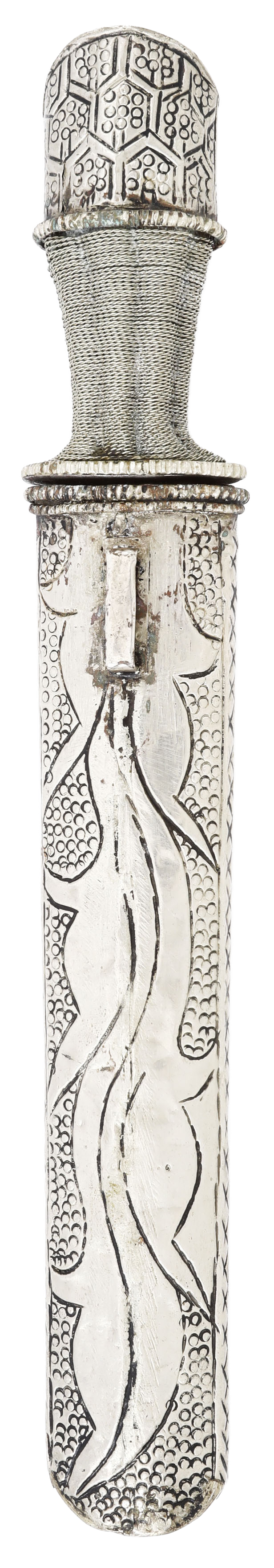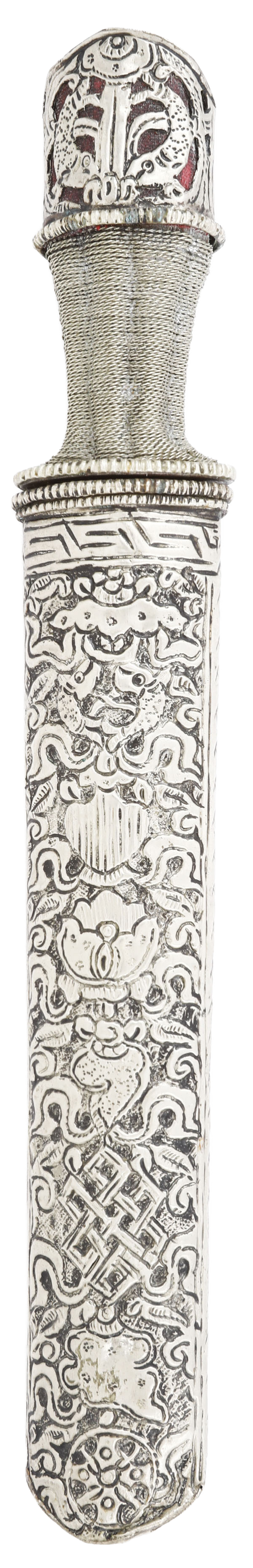 Eastern silver or white metal hilt and scabbard. The front deeply relief decorated with a dragon among foliage, a mystical knot. The pommel pierced in fish with a red fabric liner. Waisted grip in bands and reeds. Reverse decorated in large scrolling foliage. 7 1/4” wedge section blade with double back fullers and copper inlaid astrological symbol at the tip, gray with light tool finish. Hilt and scabbard excellent with good rich silver color.