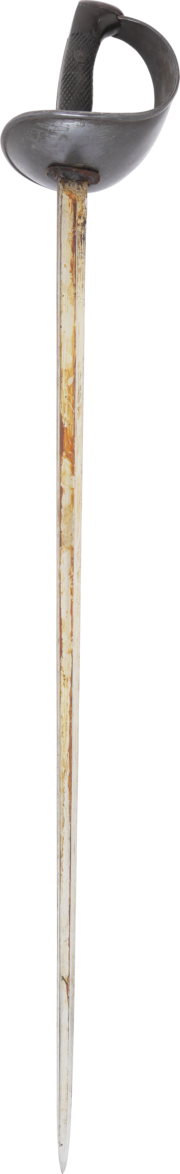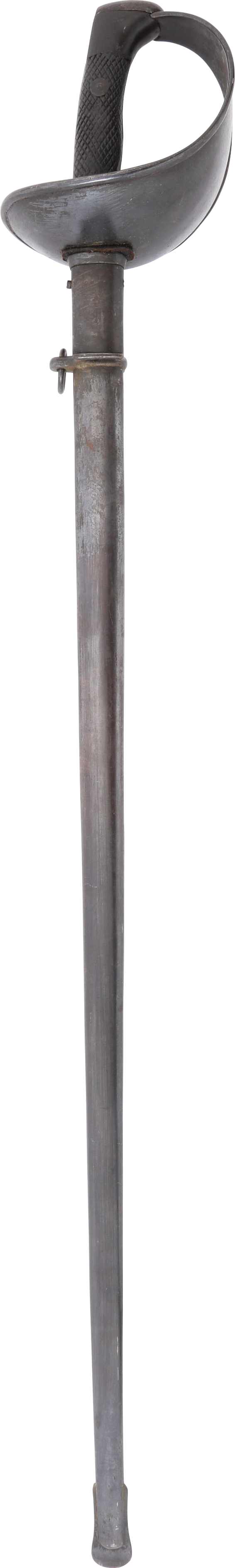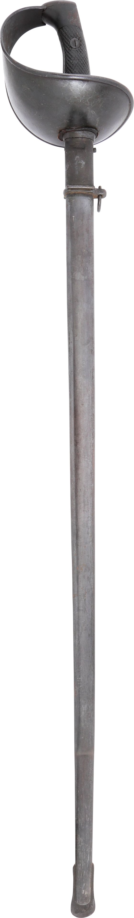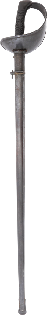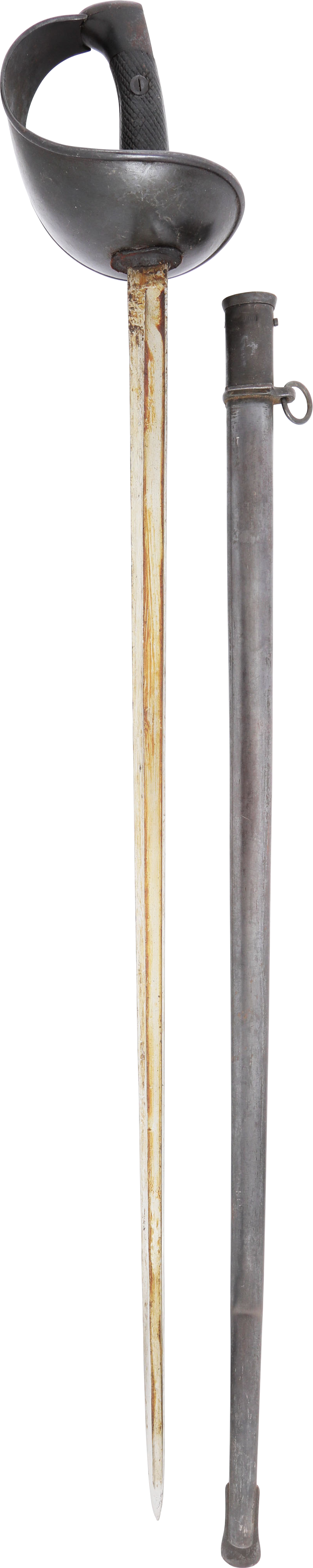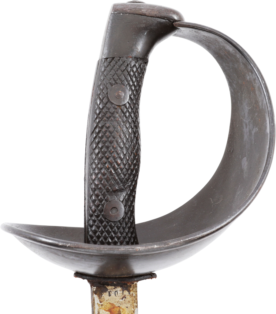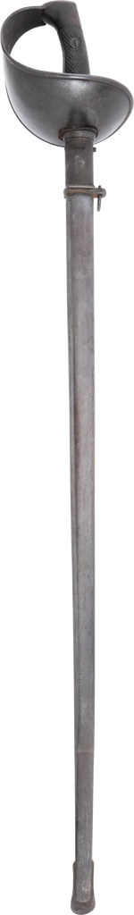 Heavy cavalry saber designed in 1907, sometimes called the 1908 pattern, but not issued until 1918. See Vicentetoledo Iron hilt with rolled edge bowl guard. Diced wood scale grips. 35 ½” straight broad fullered blade with Toledo arsenal markings at the forte and serial number. Excellent arsenal condition with heavy original preservative to the blade. The hilt and scabbard (2 small dents) with about all original black surface. Surely served in the Spanish Civil War of 1936-9 in which nearly half a million were killed. Fine display.