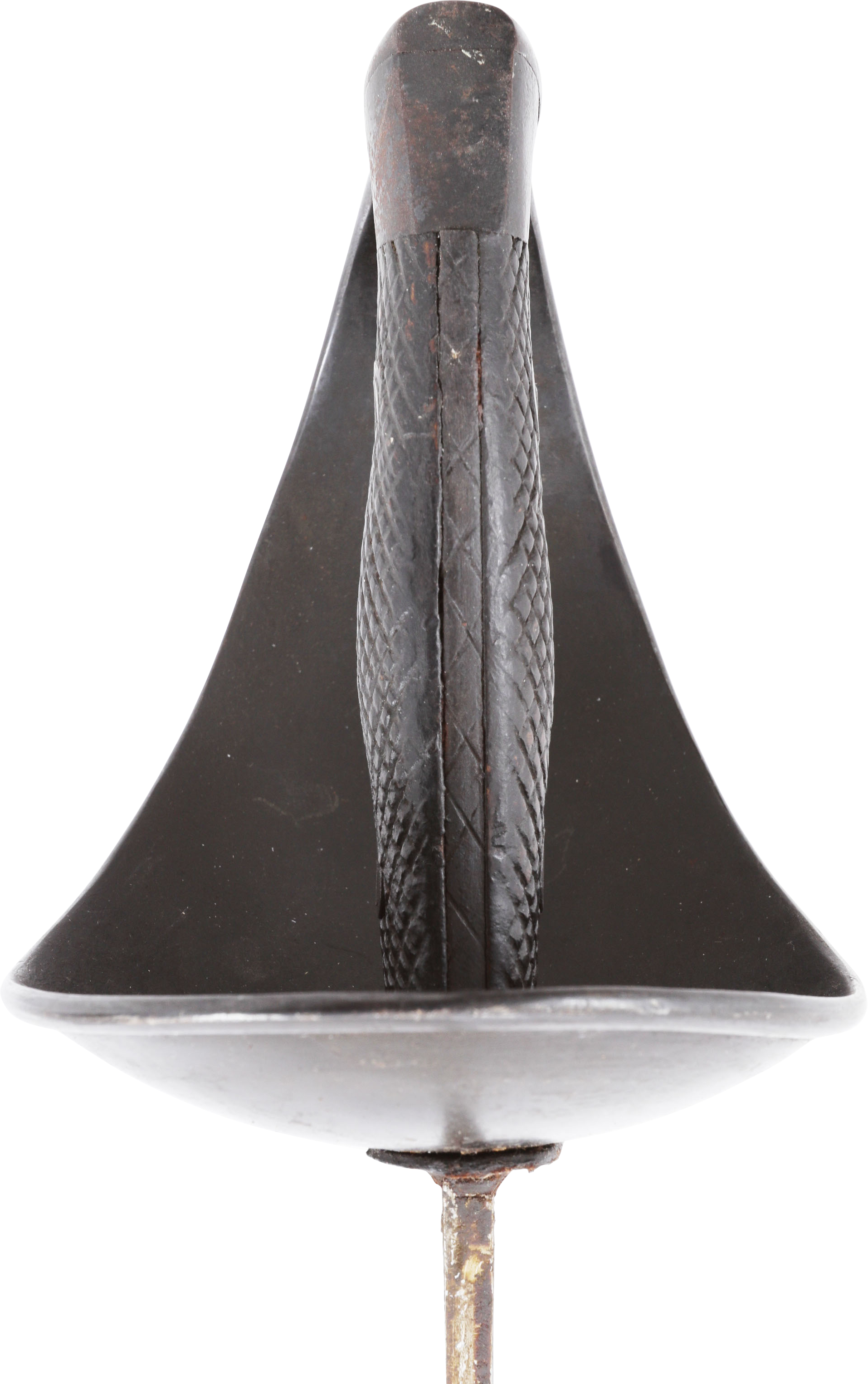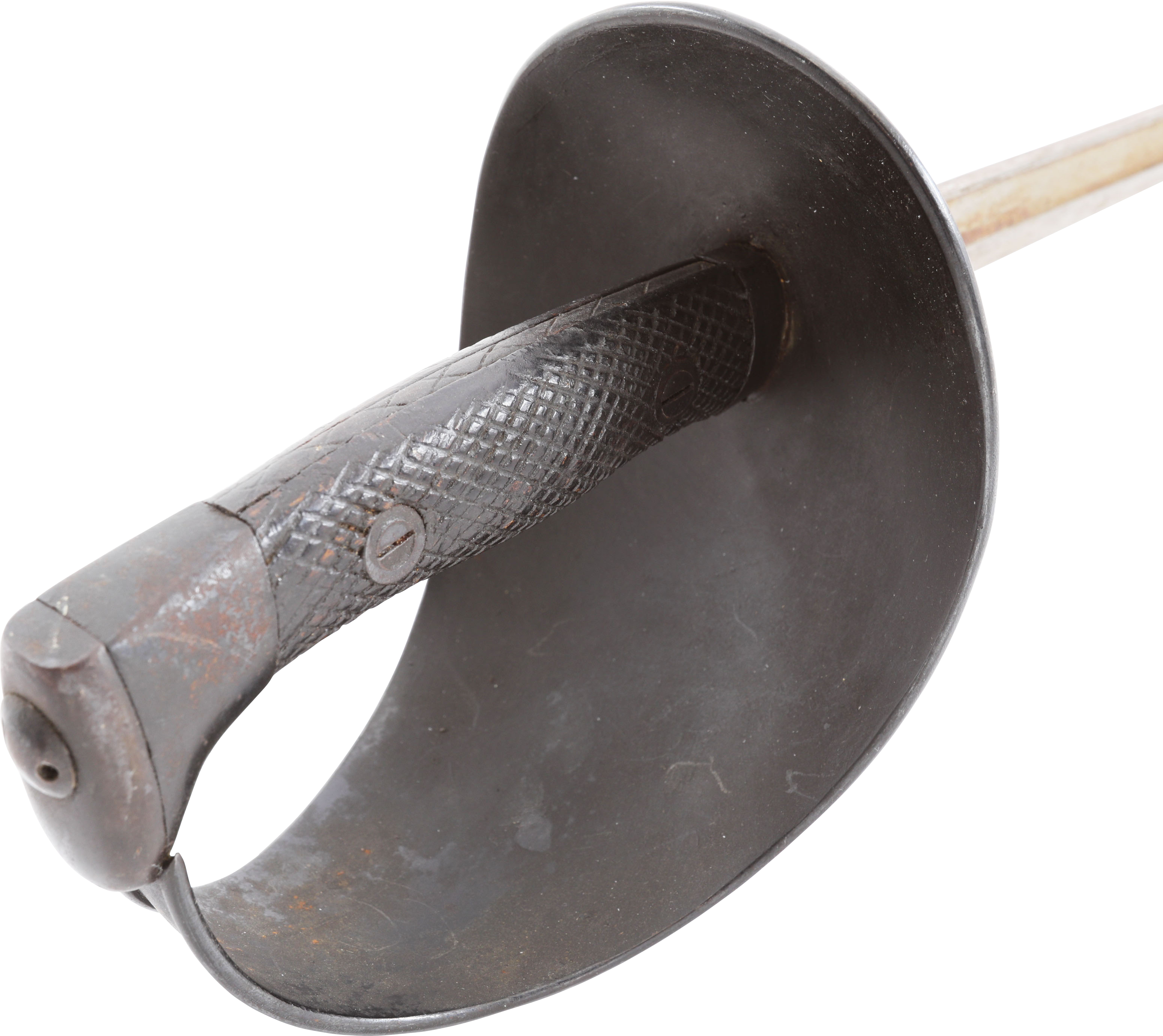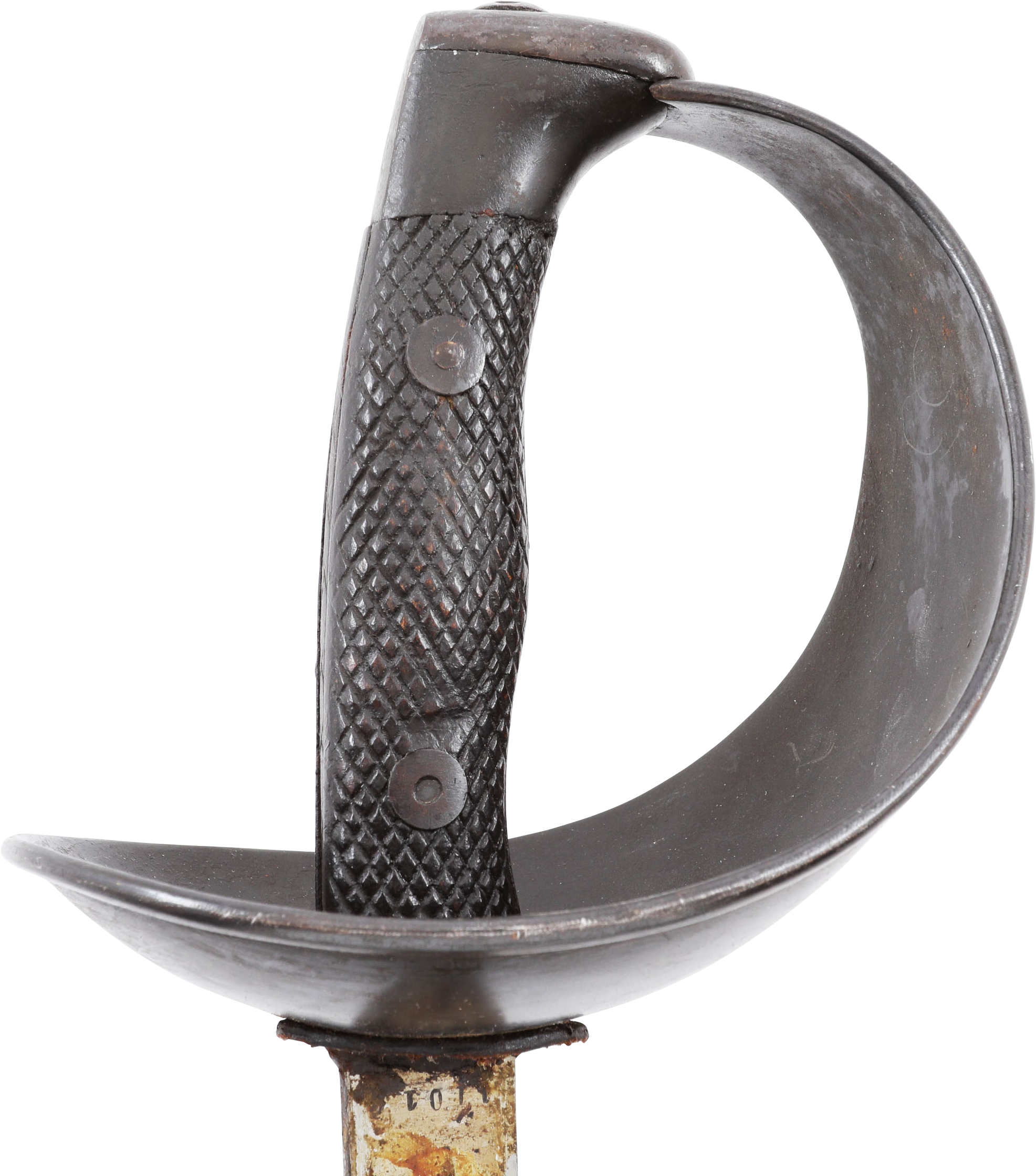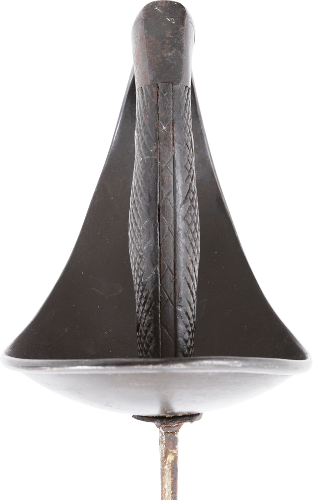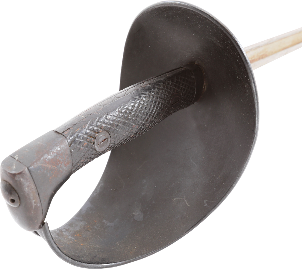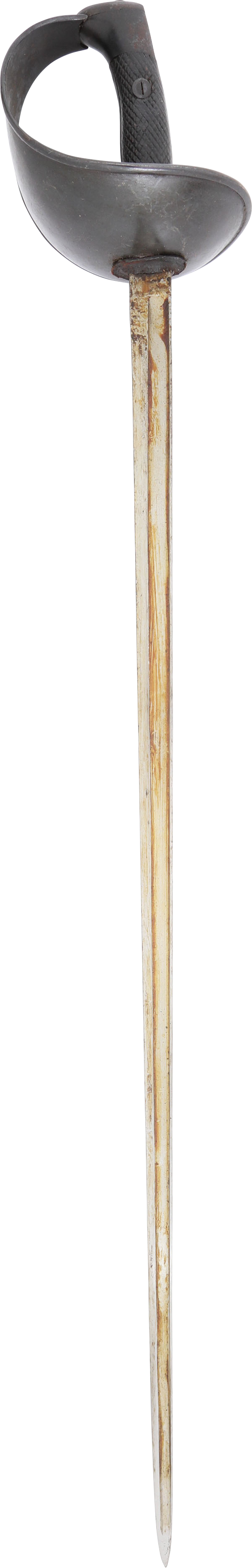 Heavy cavalry saber designed in 1907, sometimes called the 1908 pattern, but not issued until 1918. See Vicentetoledo Iron hilt with rolled edge bowl guard. Diced wood scale grips. 35 ½” straight broad fullered blade with Toledo arsenal markings at the forte and serial number. Excellent arsenal condition with heavy original preservative to the blade. The hilt and scabbard (2 small dents) with about all original black surface. Surely served in the Spanish Civil War of 1936-9 in which nearly half a million were killed. Fine display.