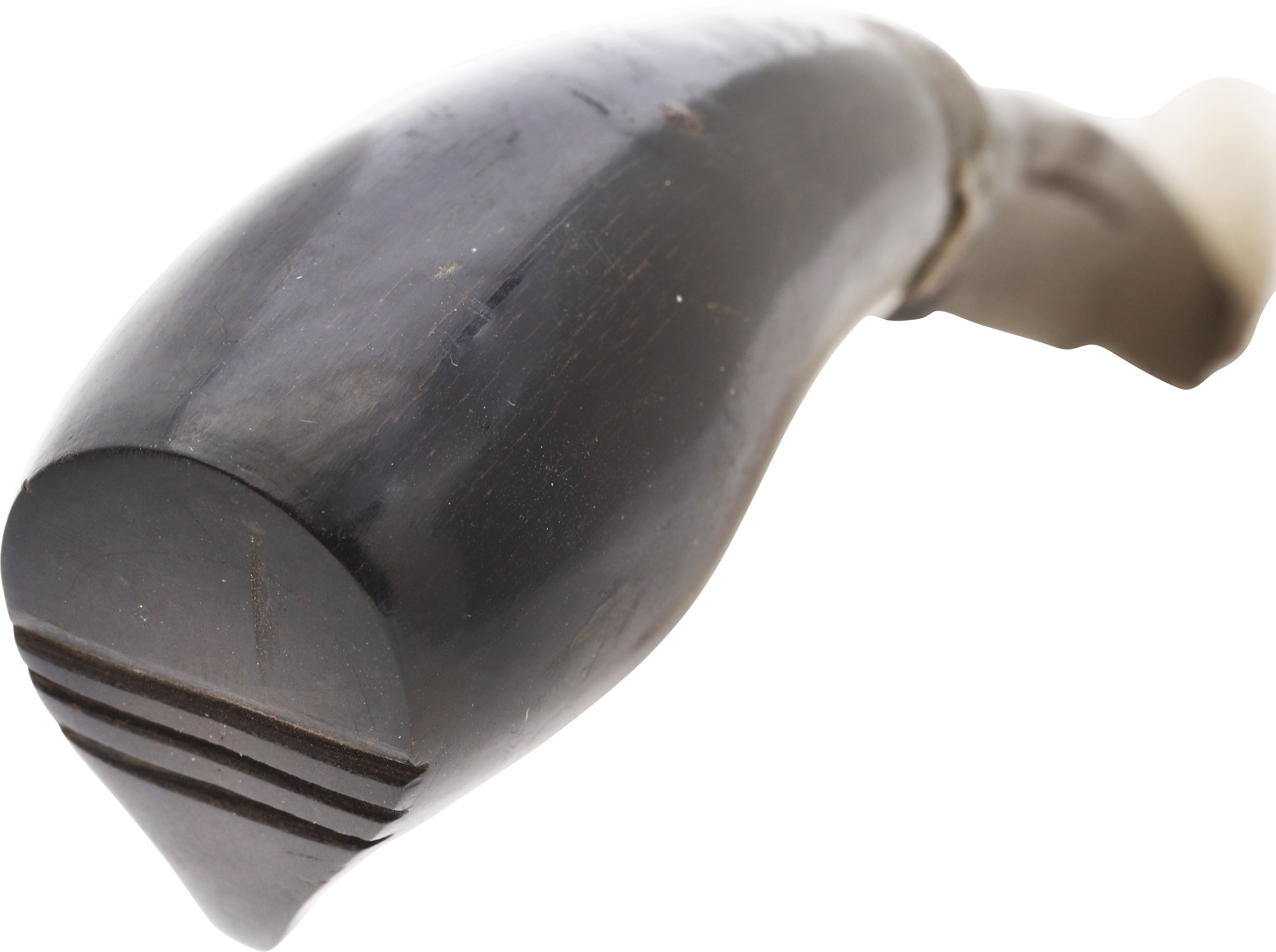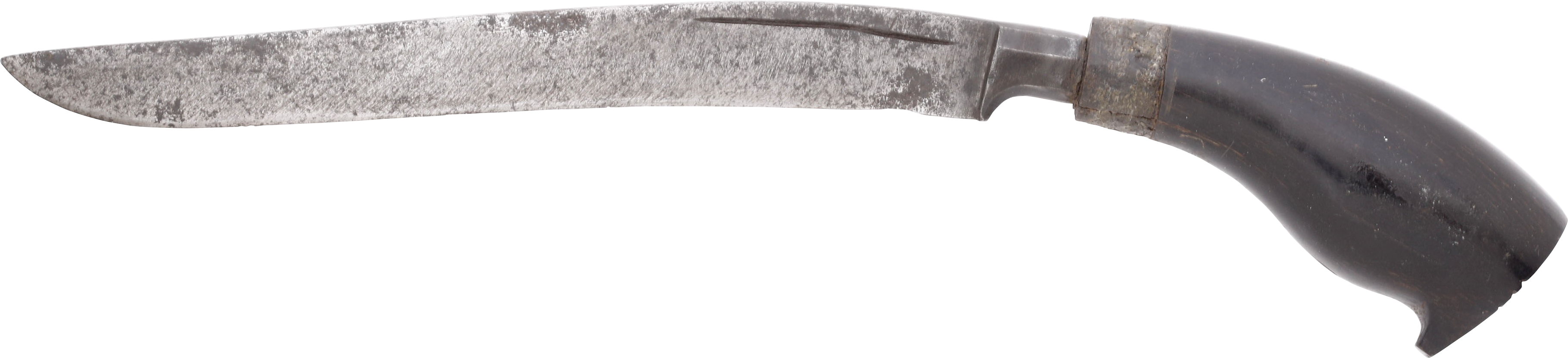 7 ¾” slightly down curved wedge section blade with faceted bolster. Finely shaped black wood hilt with peaked pommel. Iron base ferrule lacking. The badek was carried for defense and during this period, used in duels known as sigajang laleng lipa in which two combatants were bound in a single sarong armed with these daggers, to fight to the death.