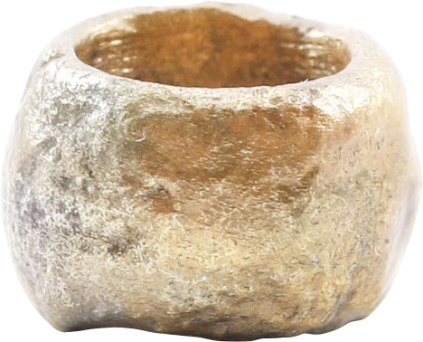 Slightly under 3/8” diameter, (0.36”). Cast, of bun form, originally gilt with the gold now restored. Beads were valued more than gold to Vikings and the produced them as well as pillaged and ransomed for them. In the 10th century, they went to Indonesia specifically to procure a ransom of their legendary miniature beads. These large beads were made by Vikings and are suitable for modern bead creations. Certificate of authenticity.