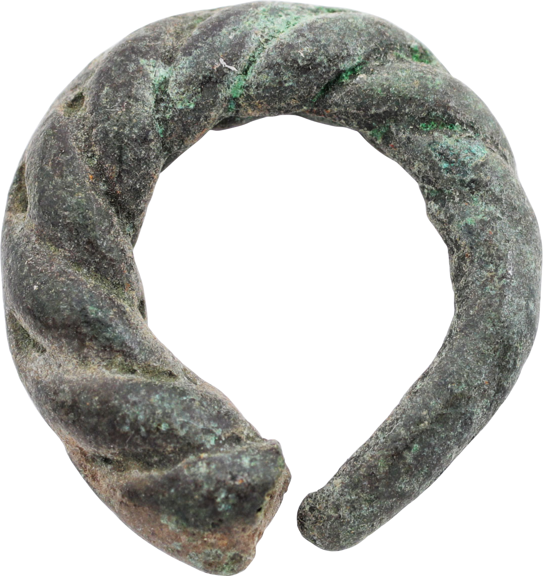 Bronze spiral form hair ring, broken in two, this half reshaped with the ends meeting.