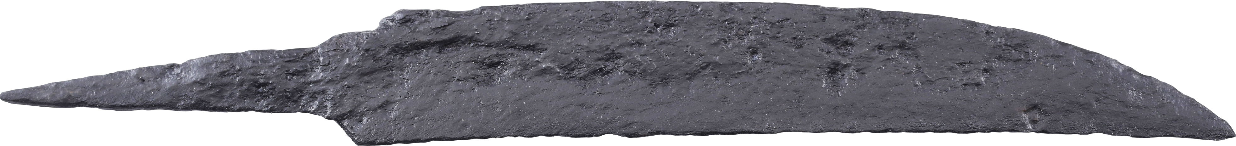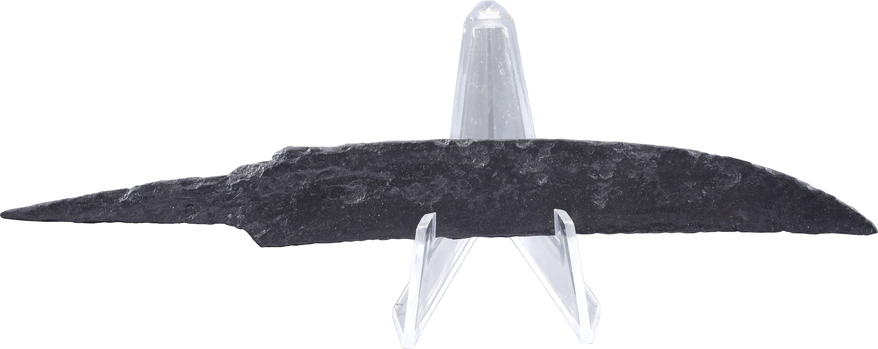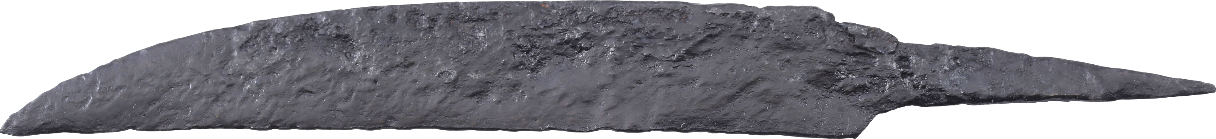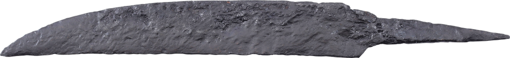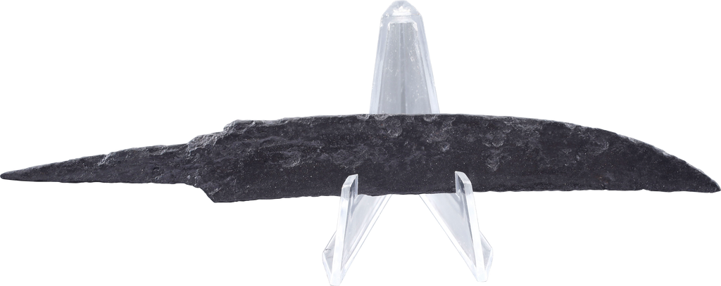 Scramasax or scramseax, both spellings used. 6 3/4” in length, of thin wedge section distinguishing it from a working knife. Curved back with an elegant downturned point. Whittle tang for mounting without a guard in a bone, antler, or wood grip. They are specifically designed for slashing and lethal in trained hands. On Plexiglas display easel with certification of authenticity.
