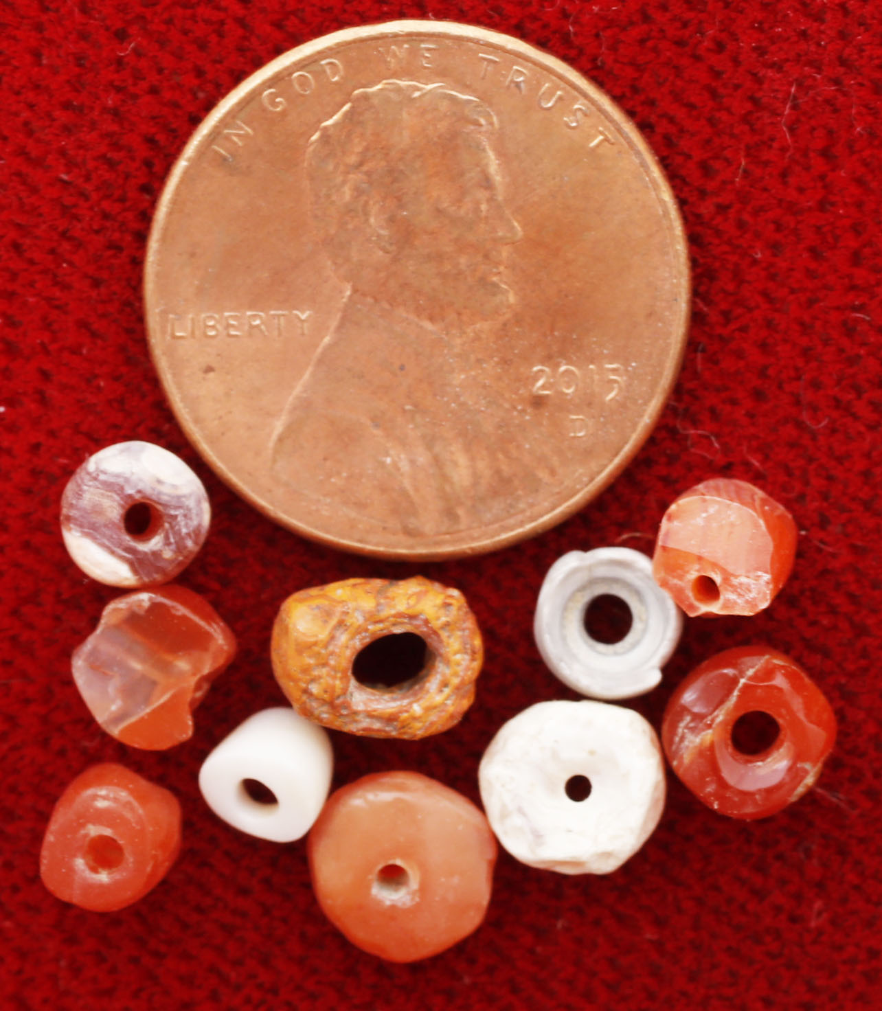Ten pieces of natural stone, carnelian, granite (?) and dark stone, polished and drilled for stringing. Small examples.