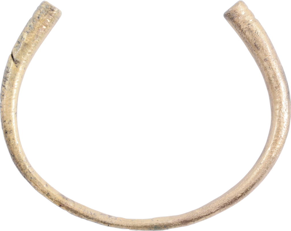 Gilt bronze, round section tapered from the banded terminals to the middle. 2.37” inside and 2.72” width, probably indicating provincial manufacture. Surface textured from burial.  Professionally refurbished with the 24karat gold surface restored for modern wear. Jewelry gift boxed with certificate of authenticity.