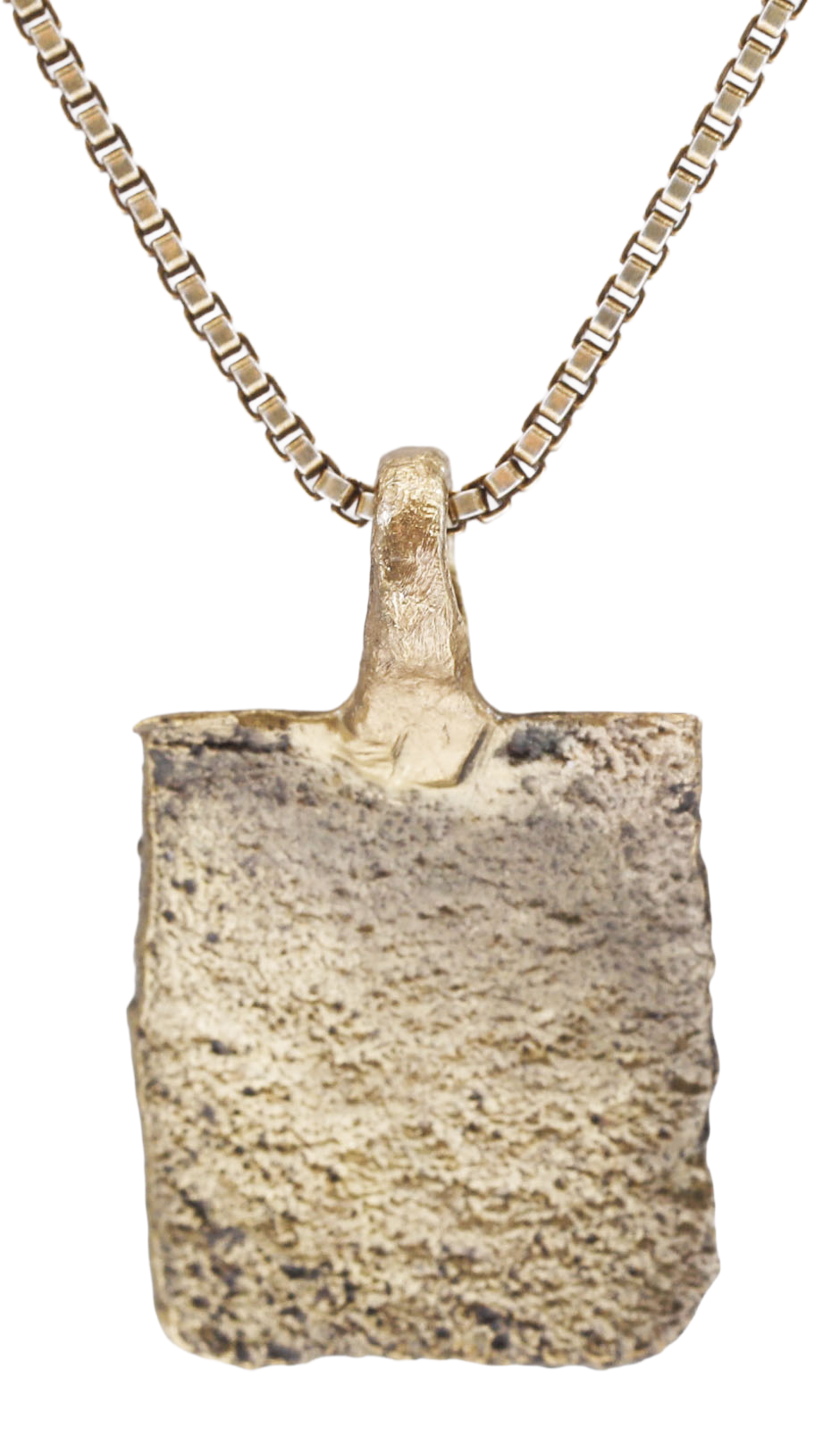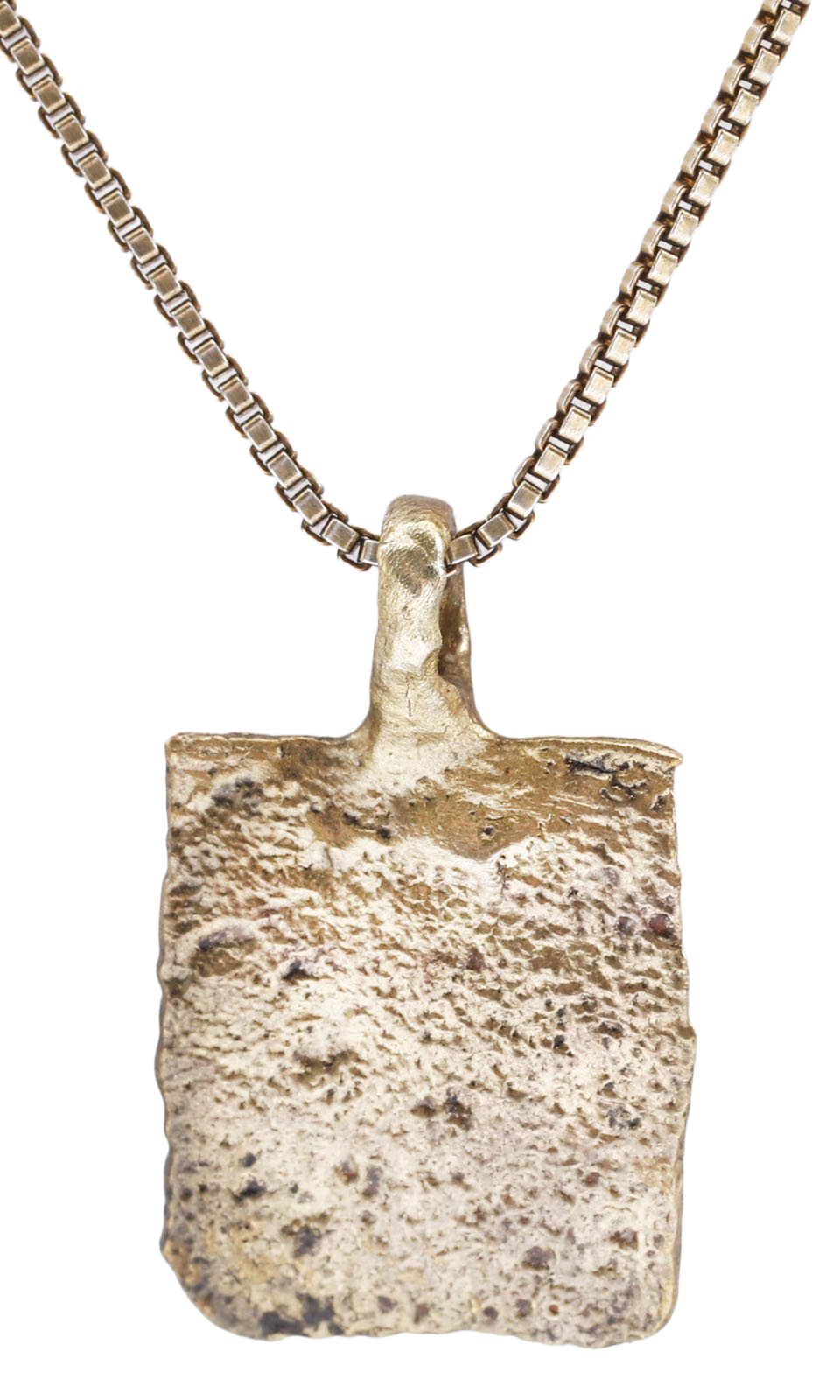 10th-11th century AD. For Vikings, breaking metal had supernatural significance. Breaking ringjarn (iron rings) as shown on the Larbro Stone, was thought to destroy the spirits of enemies. Viking weapons and accouterments were broken for burial with their owners. This is the broken end of a Viking woman warrior's bronze bracelet. It is about ½” square, (0.45” X 0.51”) with just remnants of punch decoration. The surface is heavily textured from burial. It was handcrafted by a Viking artisan 1000 years ago! For a very similar bracelet fragment dated to 879-880AD, see https://demo-ashmolean.web.ox.ac.uk/watlington-hoard. The Watlington Viking Hoard, Ashmolian Museum, Oxford was discovered in 2015. Watlington is in south Oxfordshire, about midway between Oxford and Heathrow Airport. It has been professionally refurbished with the 24karat gold overlay restored and mounted to an 18” gilt Sterling silver neck chain for modern wear. It comes with certification of authenticity, and gift boxed.