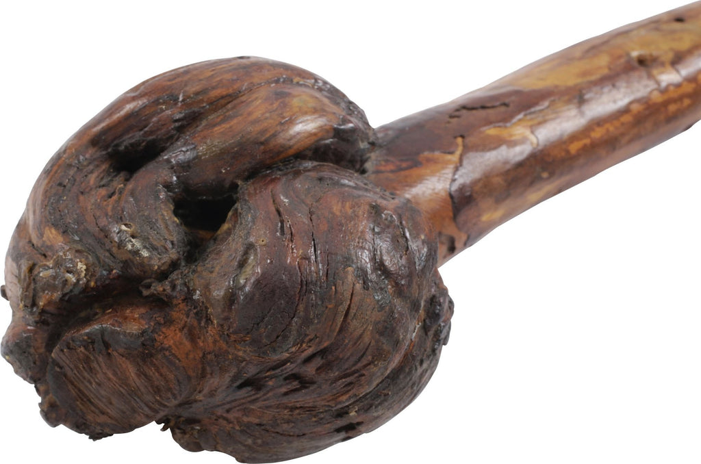 14 3/4" length with slightly tapered haft and gnarled Jack Pine canker head. Mottled surface with minor shrink checks. Head of particularly gnarled grain and coarse texture. Sound with good patina. Slightly lightened as a result of natural desiccation.
